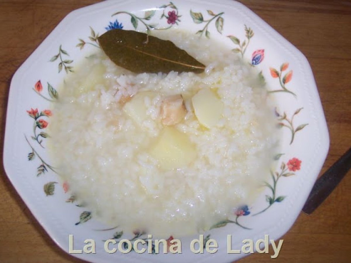 Arroz blanco con bacalao PlatoFácil45 min274 Kcal Enviar esta receta a un amigo Imprimir esta página Preguntar al autor Publicar la foto de esta receta Ingredientes 4 200 g de Arroz 1 Patata Mediana 75 g de Bacalao 3 Dientes de Ajo 1 Hoja de Laurel Aceite de Oliva Sal 600 g Agua aproximadamente Costo estimado: 2.82Euros€ (0.7€/porción)