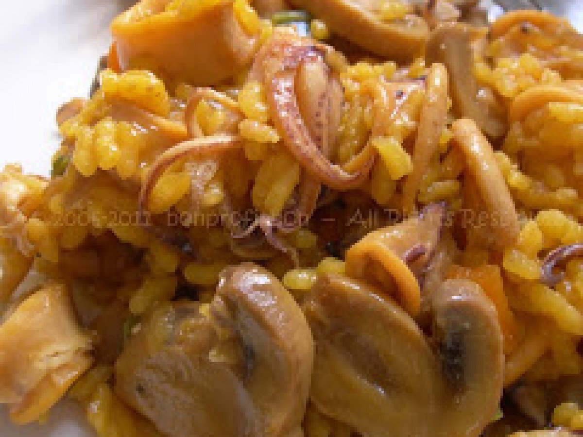 Arroz con calamares y champiñones PlatoFácil30 min Enviar esta receta a un amigo Imprimir esta página Preguntar al autor Publicar la foto de esta receta Ingredientes 2 160 g de arroz Una cebolla Un pimiento verde italiano Dos zanahorias 150 g de champiñones frescos (o un bote de conserva) 300 g de calamares 480 ml de fumet o caldo de pescado (equivale a tres partes de arroz) Aceite de oliva virgen sal, azafrán y perejil