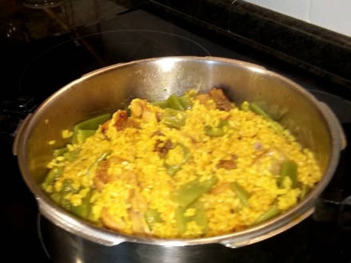 Delicioso arroz, seco, tipo paella, hecho en olla rápida.