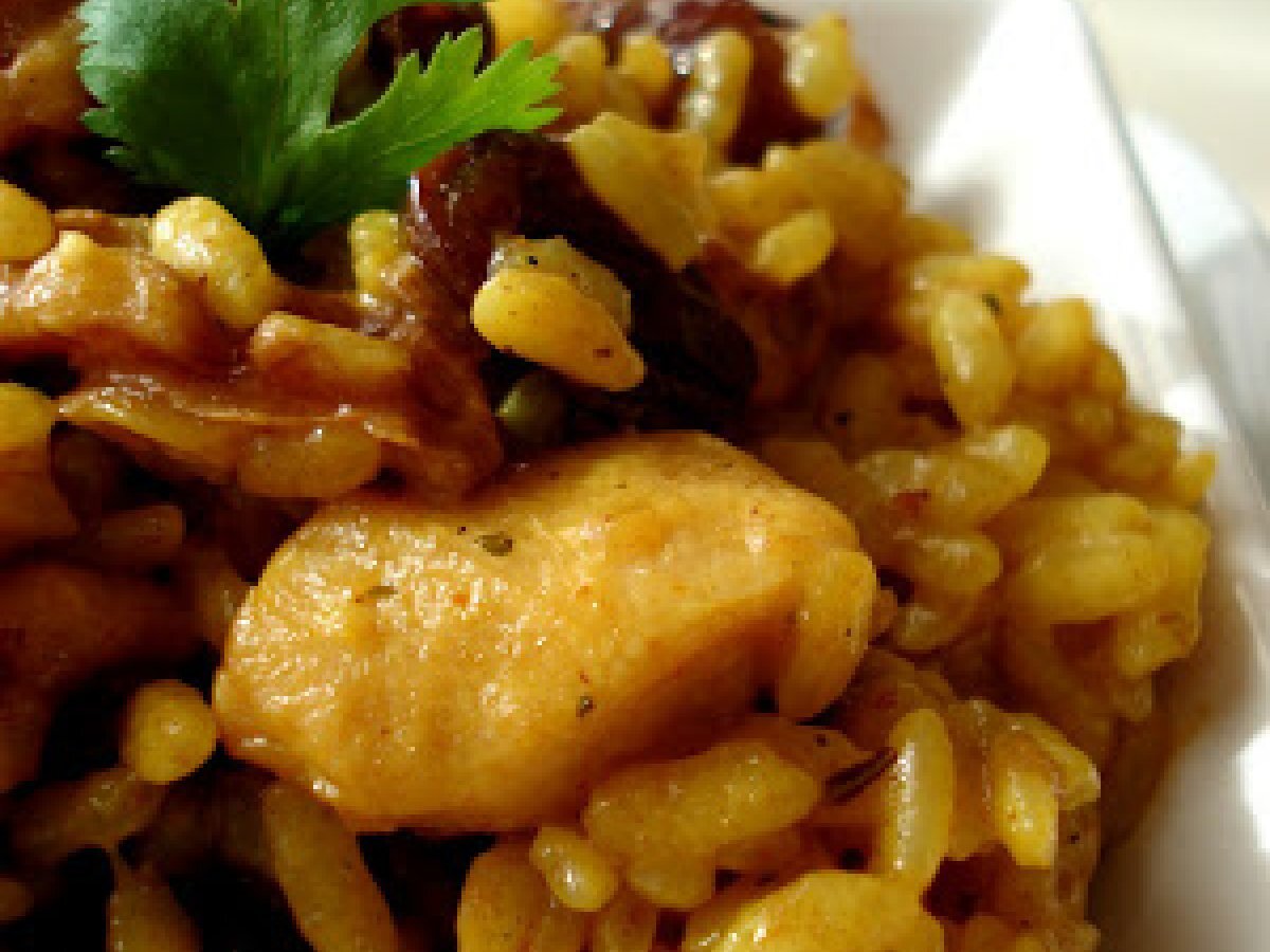 Arroz con pollo, pasas y nueces al "ras el hanout" PlatoMedio50 min422 Kcal Enviar esta receta a un amigo Imprimir esta página Preguntar al autor Publicar la foto de esta receta Ingredientes 2 * 1 vaso de arroz * 2 vasos de caldo de pollo * 1/4 de cebolla * 1 pechuga de pollo * Un puñado de pasas moscatel * Un puñado de nueces * Un chorro de vino blanco * 1 cucharada de Ras el Hanout * Ajo y perejil * Aceite y sal Costo estimado: 3.31Euros€ (1.66€/porción)