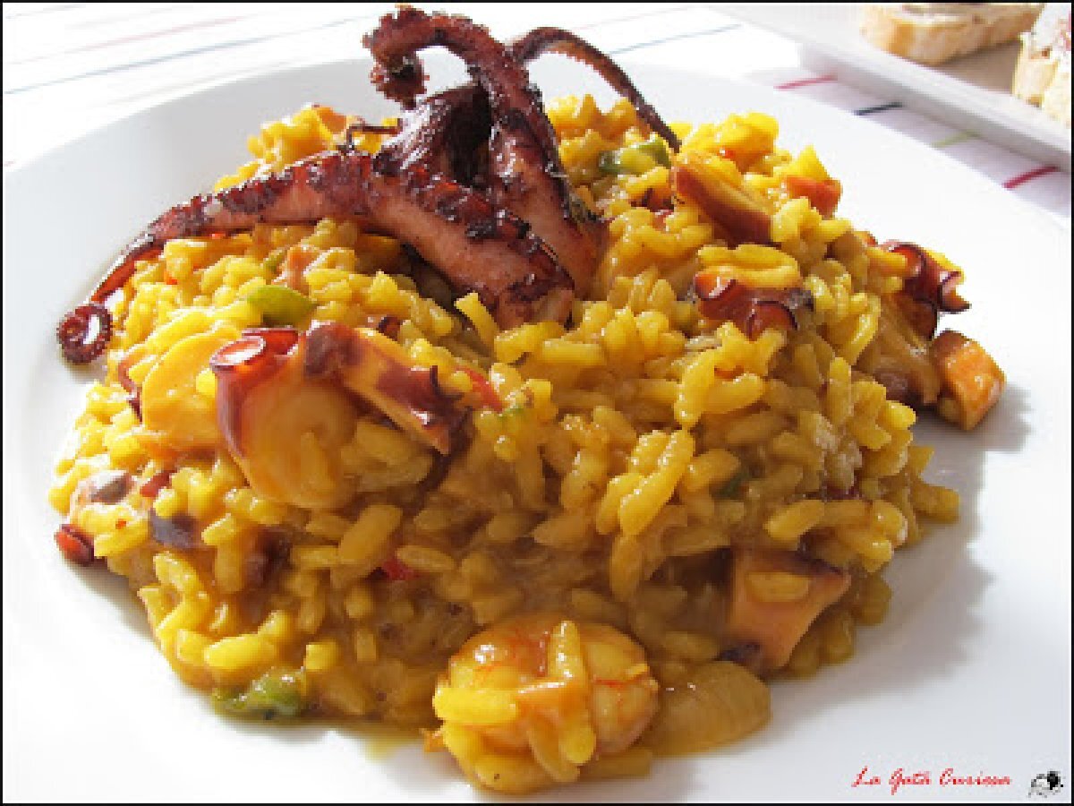 Arroz cremoso con gambas y pulpo PlatoFácil50 min815 Kcal Enviar esta receta a un amigo Imprimir esta página Preguntar al autor Publicar la foto de esta receta Ingredientes 2 4 patas de pulpo, 100 gramos de gambas peladas, 12 cabezas de gambas, ½ cebolla, ½ pimiento verde, ½ pimiento rojo, 2 dientes de ajo, media ñora frita y picada, unas hebras de azafrán, un trocito de guindilla, sal, aceite de oliva virgen, 4 tacitas de arroz de grano redondo.