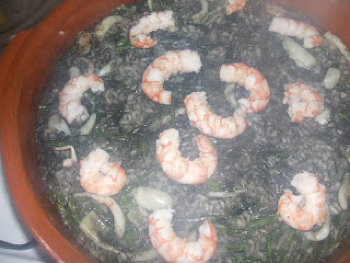 Arroz negro con calamares, gambones y trigueros. PlatoFácil30 min Enviar esta receta a un amigo Imprimir esta página Preguntar al autor Publicar la foto de esta receta Ingredientes 2 300 g de arroz 250 g de anillas de calamar 250 g de gambones un puñado de espárragos trigueros 2 bolsitas de tinta de calamar 1 cebolla 4 ajos caldo de pescado