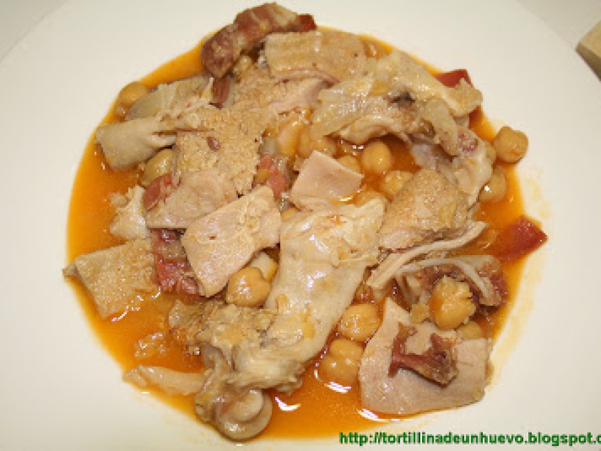 Callos con manitas de cabrito y garbanzos PlatoFácil1 hora Enviar esta receta a un amigo Imprimir esta página Preguntar al autor Publicar la foto de esta receta Ingredientes 8 750 g de callos de ternera 250 g de cabeza de ternera 8 manitas de cabrito 1 chorizo para cocinar 1 loncha de jamón gordita 250 g de garbanzos hervidos 1 cebolla grandota 1 hoja de laurel 1/2 cucharada de harina 1 guindilla