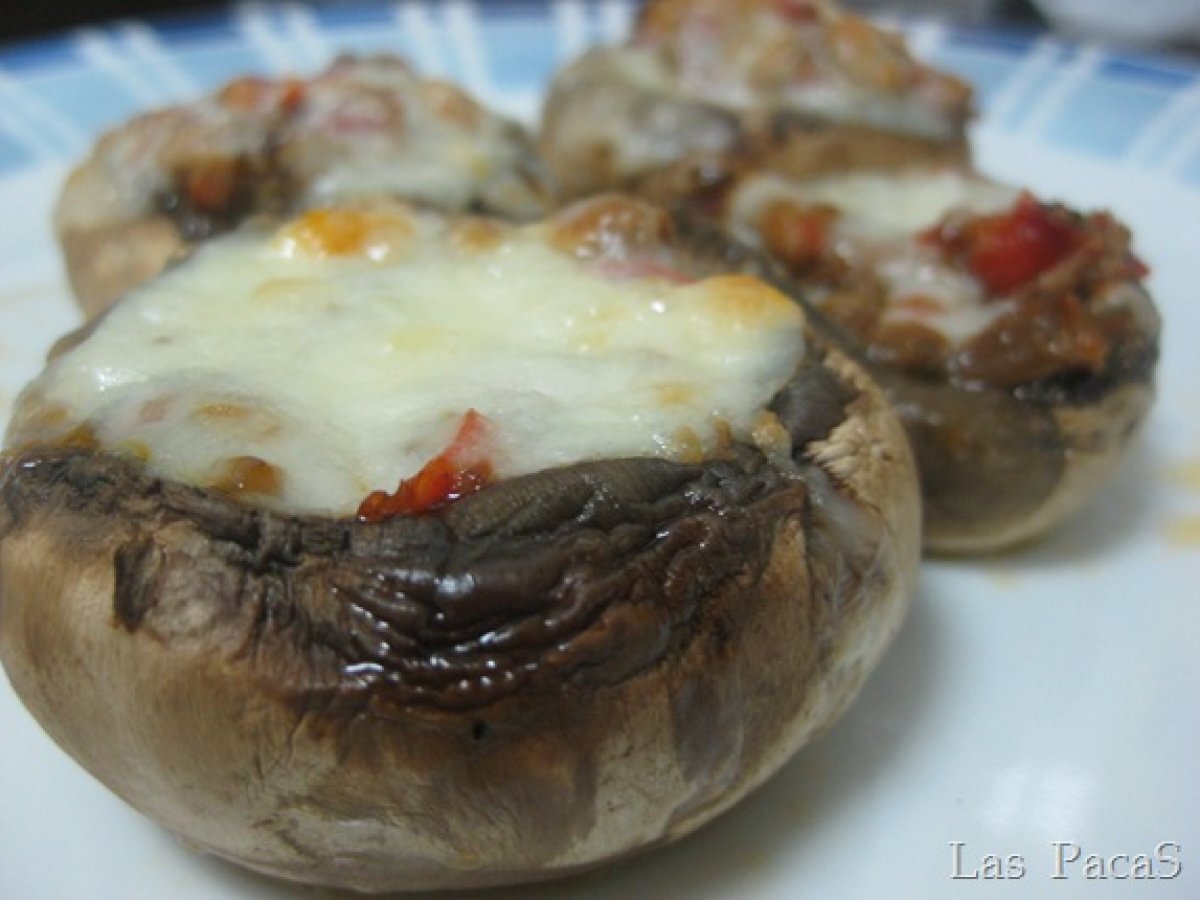 Champiñones rellenos de atún (thermomix) PlatoMedio45 min Enviar esta receta a un amigo Imprimir esta página Preguntar al autor Publicar la foto de esta receta Ingredientes 2 24 champiñones frescos grandes 200 gr. de atún 1 pimiento rojo aceite de oliva 50 gr. de vino blanco sal, perejil queso rallado para gratinar