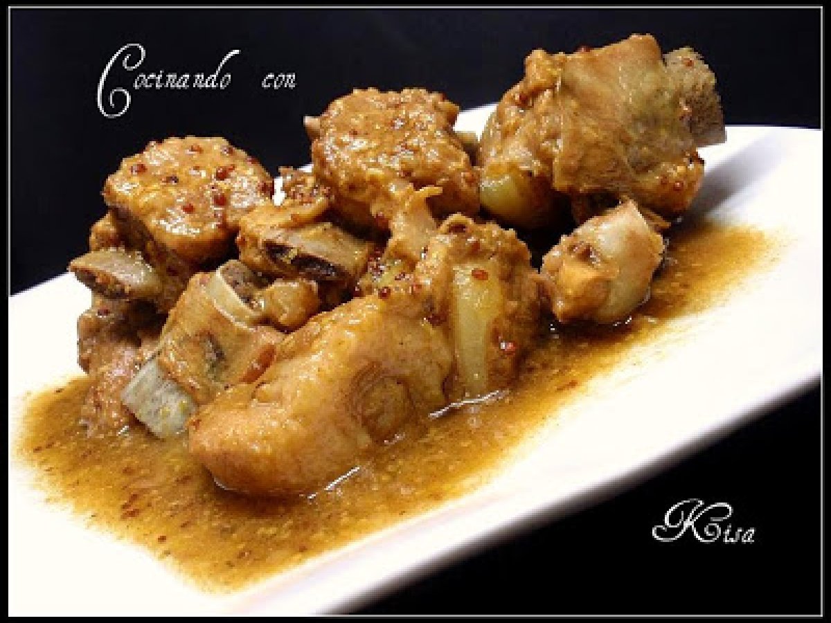 Costillas de cerdo a la mostaza antigua (fussioncook) PlatoFácil45 min Enviar esta receta a un amigo Imprimir esta página Preguntar al autor Publicar la foto de esta receta Ingredientes 4 1 kilo de costillas de cerdo troceadas El zumo de 1 limón Vino blanco hasta la marca del vaso medidor 1 pastilla de caldo de verduras Pimienta de colores 1 hoja de laurel 7 ajos Aceite hasta la mitad de la marca 40 del vaso medidor 2 cucharas soperas de mostaza antigua 1 pizca de colorante