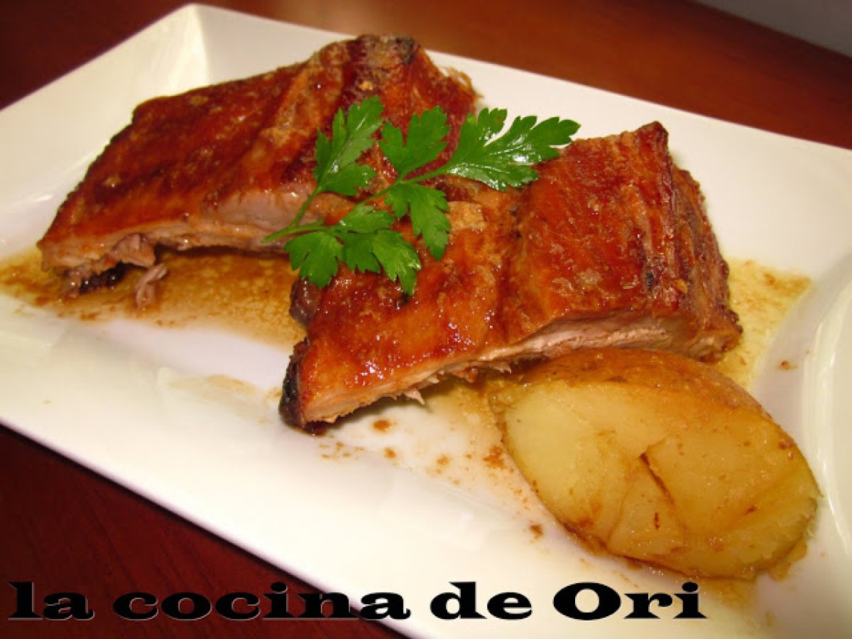 Costillas de cerdo asadas con salsa barbacoa PlatoFácil2 h 25 m Enviar esta receta a un amigo Imprimir esta página Preguntar al autor Publicar la foto de esta receta Ingredientes 4 1 tira de costillas carnosas de aprox 1700 g sal 1/2 vaso de vino blanco un chorreoncito de aceite de oliva virgen extra salsa barbacoa