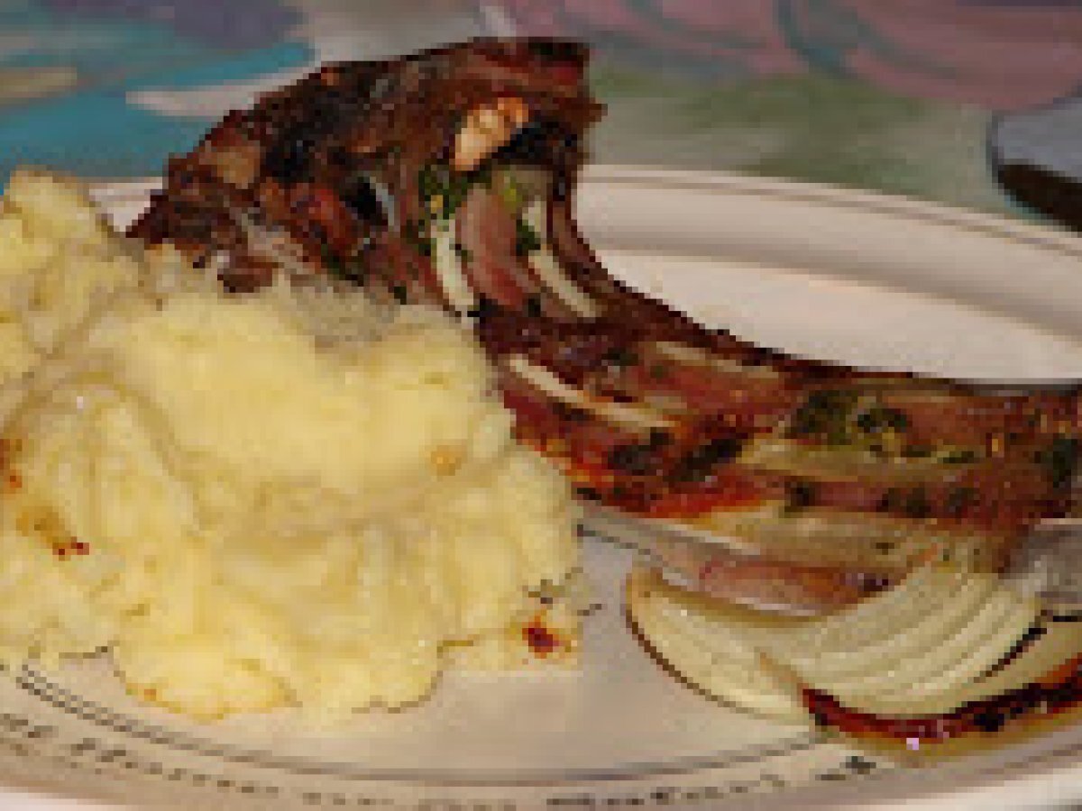Costillitas de cordero al horno con puré de papas PlatoFácil1 h 5 m Enviar esta receta a un amigo Imprimir esta página Preguntar al autor Publicar la foto de esta receta Ingredientes 4 Para las costillitas: 1 kg. de costillar de cordero 2 cebollas cortadas en cuartos 2 cdas. de perejil picado 1 diente de ajo picado Sal Pimienta Para el puré de papas: 5 papas medianas 1 cda. de manteca ½ tza. de leche 1 huevo 2 cdas. de queso parmesano rallado Nuez moscada Sal Pimienta
