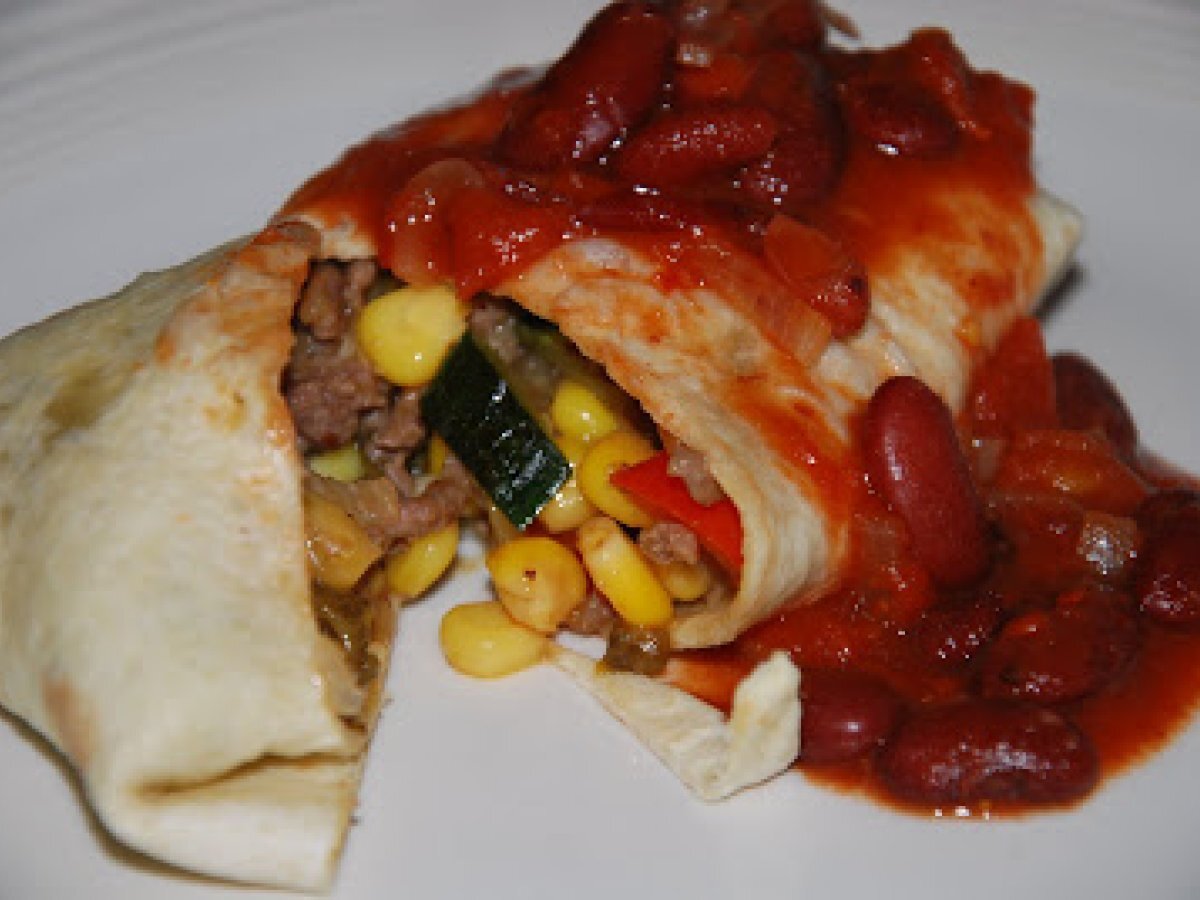 El inventor71: tortillas rellenas de carne con salsa de frijoles PlatoFácil30 min Enviar esta receta a un amigo Imprimir esta página Preguntar al autor Publicar la foto de esta receta Ingredientes 1 Chiles chipotles o chili normal Una lata de frijoles o alubias pintas Tortillas de trigo mexicanas Medio calabacín Medio pimiento rojo Una lata de maíz 400 g de carne de ternera picada 1 cebolla grande 1 diente de ajo Aceite, pimienta y sal 1 lata de tomate natural triturado
