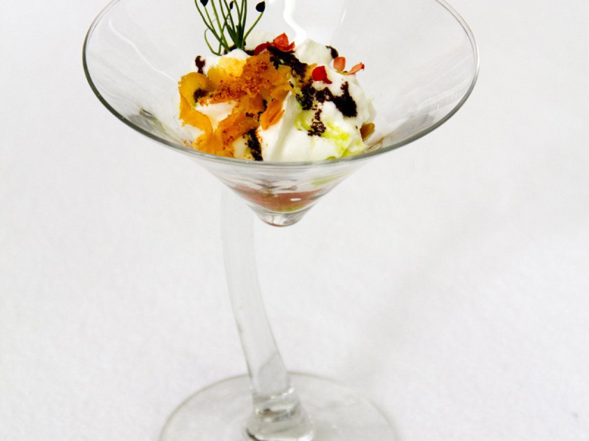 Ensalada capresse con garum, aceituna negra y hueva de mújol PlatoMedio20 min Enviar esta receta a un amigo Imprimir esta página Preguntar al autor Publicar la foto de esta receta Ingredientes 2 Tomate Albahaca Tomillo Romero Piñones Aceite de oliva, acidez 0,4 Garum de mújol Salazones Serrano Hueva de mújol Salazones Serrano Puré de aceituna negra Sal Azúcar Para un sifón de mozzarella 250 gr de mozzarella 200 cl de leche 200 cl de nata 1 hoja de gelatina Sal Pimienta negra