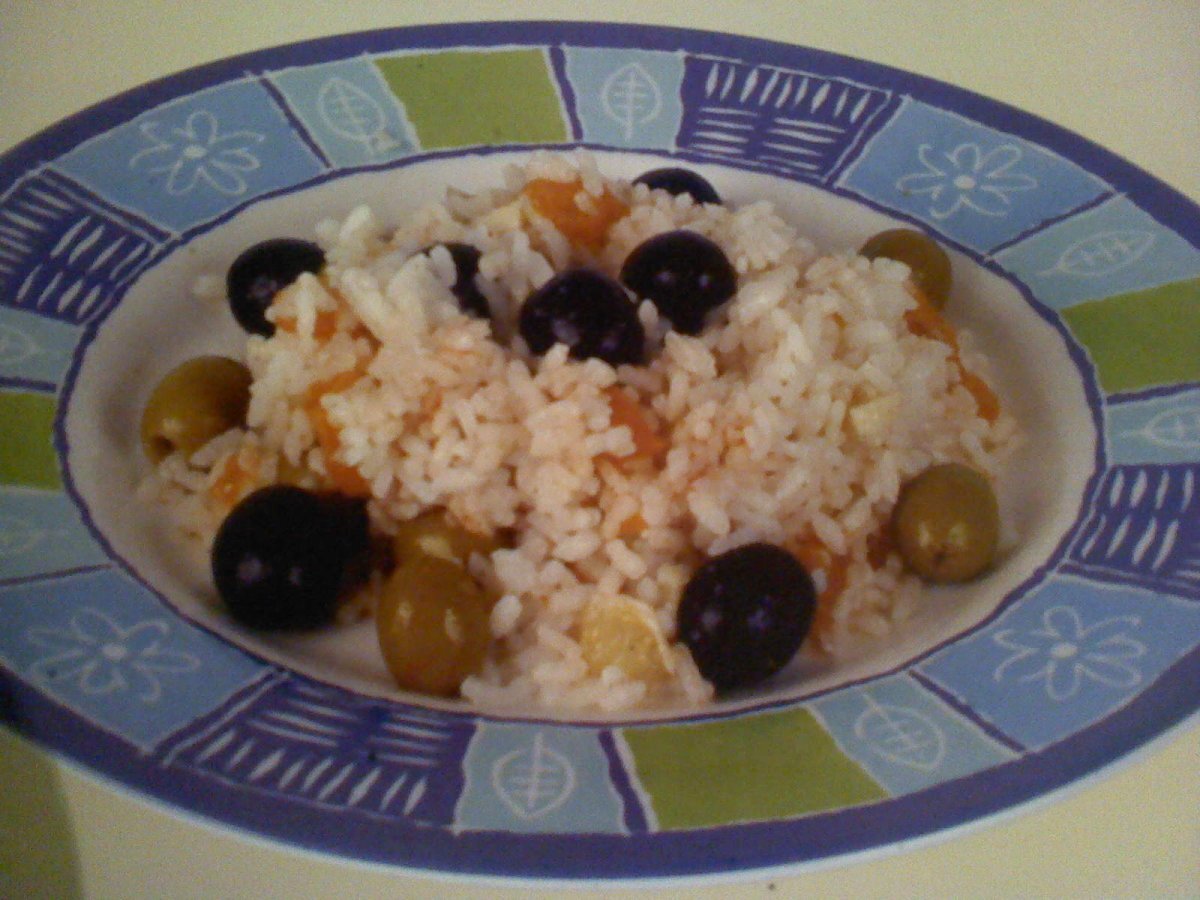 Ensalada de arroz con aceitunas PlatoMedio1 hora Enviar esta receta a un amigo Imprimir esta página Preguntar al autor Publicar la foto de esta receta Ingredientes 4 300 gr de arroz, 120 gr de aceitunas negras,120 de aceitunas verdes, un limón 2 naranjas, pimentón, comino y sal.