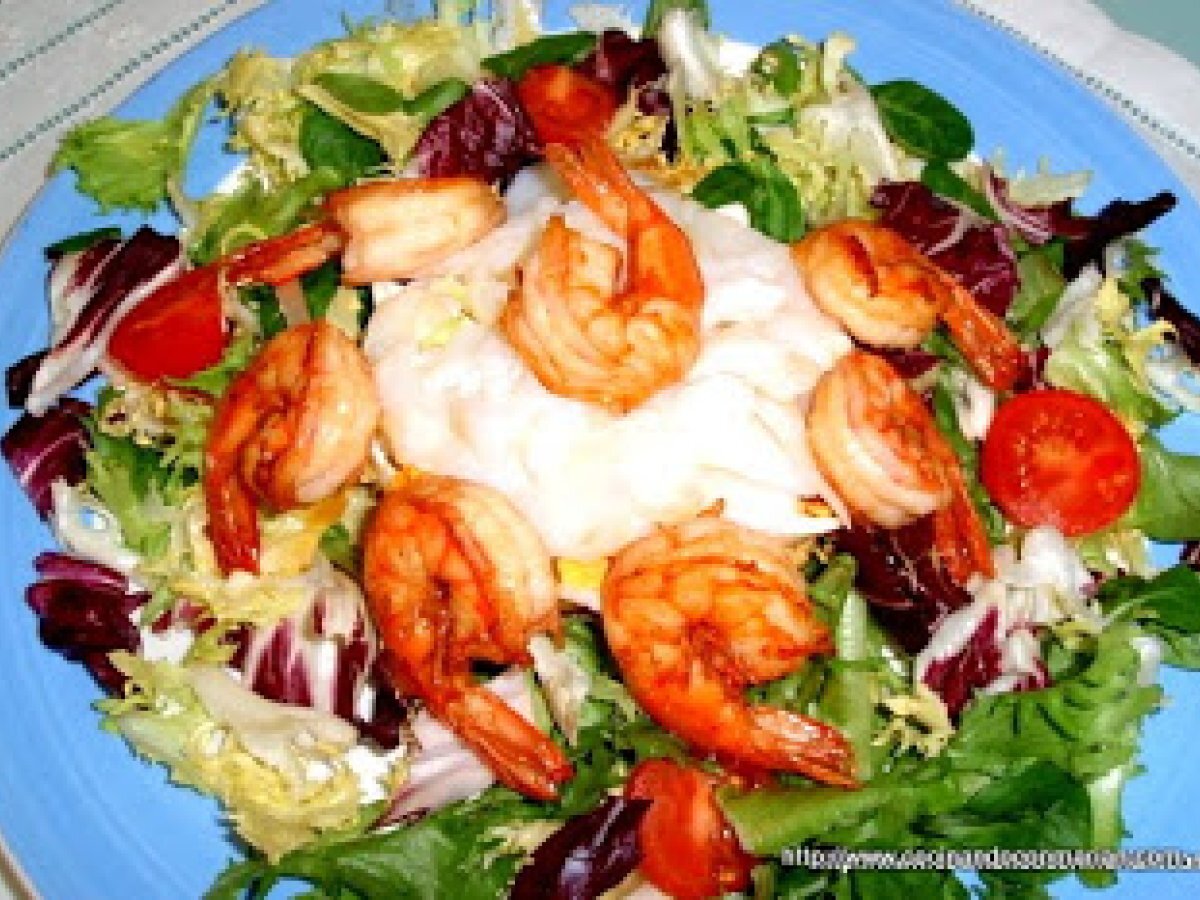 Ensalada de bacalao confitado y langostinos fritos PlatoFácil35 min Enviar esta receta a un amigo Imprimir esta página Preguntar al autor Publicar la foto de esta receta Ingredientes 2 Lechugas variadas 1 tajada de bacalao 12 langostinos 8 tomates cherri 6 cucharadas de aceite, 2 de vinagre de sidra, 1 de vinagre de módena y sal