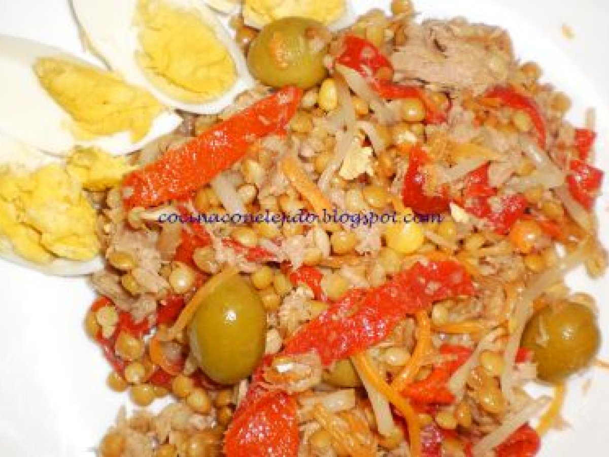 Ensalada de lentejas superrapida PlatoFácil10 min Enviar esta receta a un amigo Imprimir esta página Preguntar al autor Publicar la foto de esta receta Ingredientes 7 1 bote de lentejas cocidas 1 pimiento rojo asado cortado a tiras 1 bote de ensalada china 3 latas de atún 3 huevos cocidos picados Aceitunas Aceite Vinagre Sal