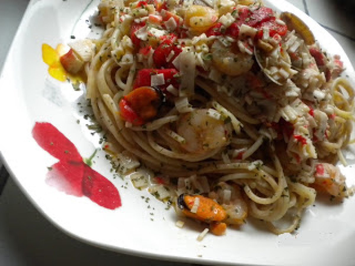 Espaguetis integrales a la marinera vota ahora PlatoFácil30 min286 Kcal Enviar esta receta a un amigo Imprimir esta página Preguntar al autor Publicar la foto de esta receta Ingredientes 3 Espaguetis integrales Ajo Almejas Pimientos del piquillo o asados Gambas peladas Mejillones Palitos de cangrejo Vino blanco Un poquito de agua Sal Aceite de oliva Perejil