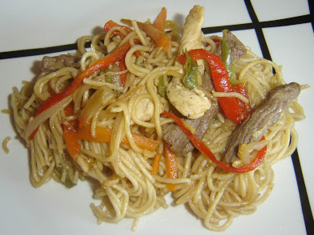 Fideos chinos con tres delicias PlatoFácil25 min516 Kcal Enviar esta receta a un amigo Imprimir esta página Preguntar al autor Publicar la foto de esta receta Ingredientes 4 300 G Fideos Chinos 250 G de Ternera 250 G de Pechuga de Pollo 1 Pimiento Rojo 1 Pimiento Verde 1 Cebolla pequeña 100 G de Zanahoria 100 G de Brotes de Soja 6-8 Cucharadas de Salsa de Soja Sal y Pimienta Aceite de Oliva Costo estimado: 9.83Euros€ (2.46€/porción)