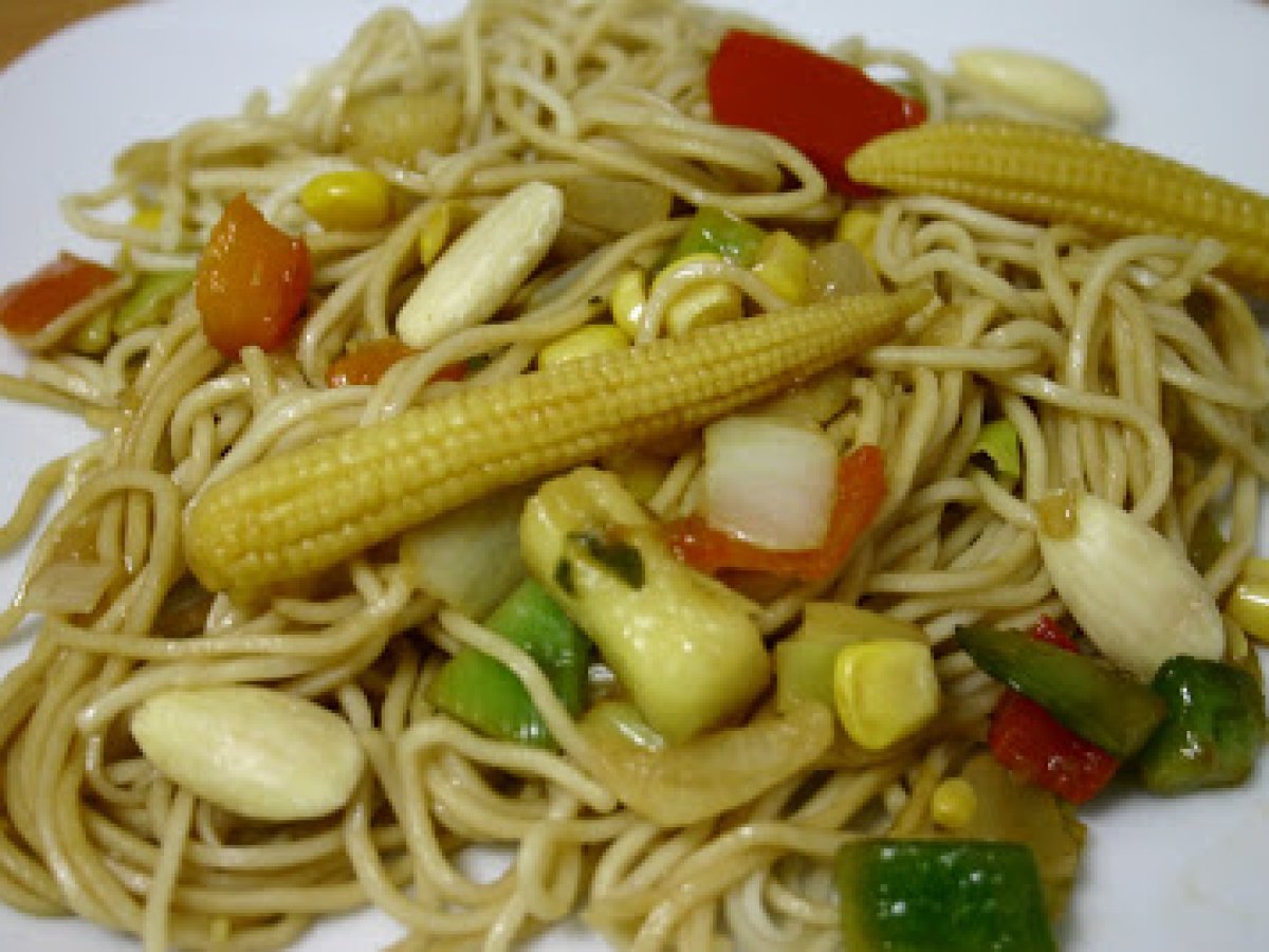 Fideos chow mein con verduras y almendras en salsa de ostras. PlatoFácil30 min Enviar esta receta a un amigo Imprimir esta página Preguntar al autor Publicar la foto de esta receta Ingredientes 4 1 paquete de fideos Chow Mein Aceite de cacahuete Verduras cortadas en juliana : Calabacín zanahoria cebolla puerro pimiento rojo y verde maiz y mazorquitas de maiz pequeñas bambú Un puñadito de almendras crudas Salsa para wok
