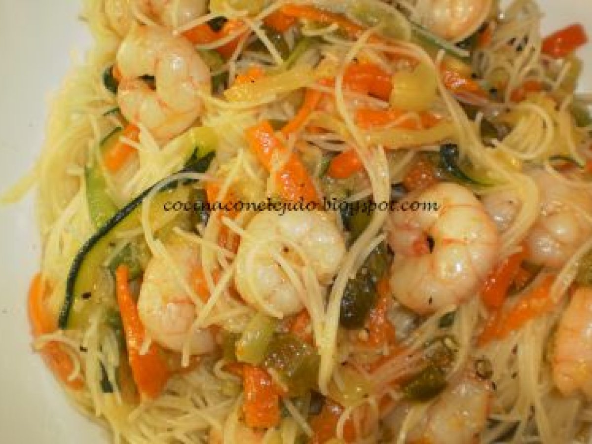 Fideos de arroz con gambas y soja PlatoMedio50 min142 Kcal Enviar esta receta a un amigo Imprimir esta página Preguntar al autor Publicar la foto de esta receta Ingredientes 4 fideos de arroz calabacin a tiras finas pimiento rojo asado a tiras finas zanahorias a tiras finas salsa de soja aceite sal gambas peladas Costo estimado: 1.98Euros€ (0.49€/porción)