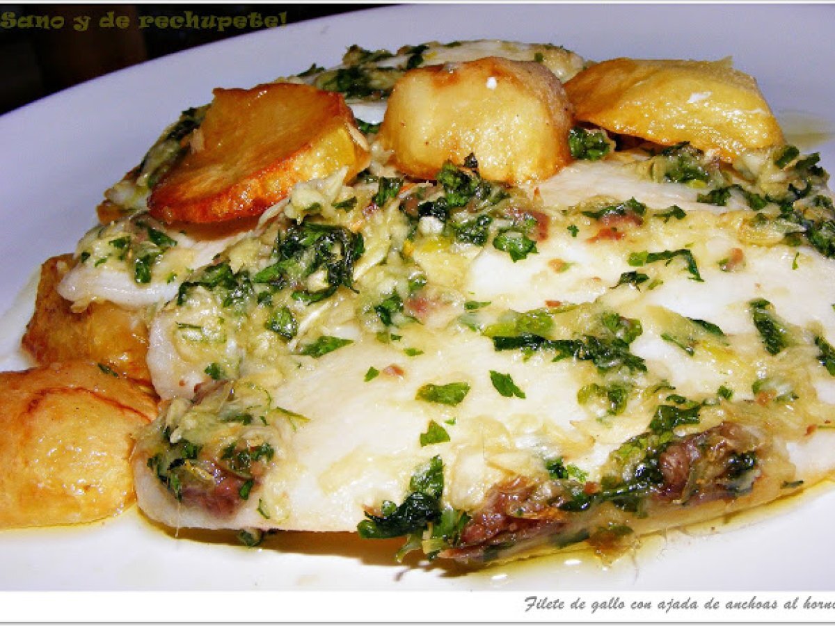Filete de gallo con ajada de anchoas al horno PlatoFácil30 min5884 Kcal Enviar esta receta a un amigo Imprimir esta página Preguntar al autor Publicar la foto de esta receta Ingredientes 2 4 filetes de gallo. 4 papas medianas. 4 dientes de ajo. un manojito de perejil. 2 anchoas. sal, pimienta y aceite de oliva. Costo estimado: 6.23Euros€ (3.11€/porción)