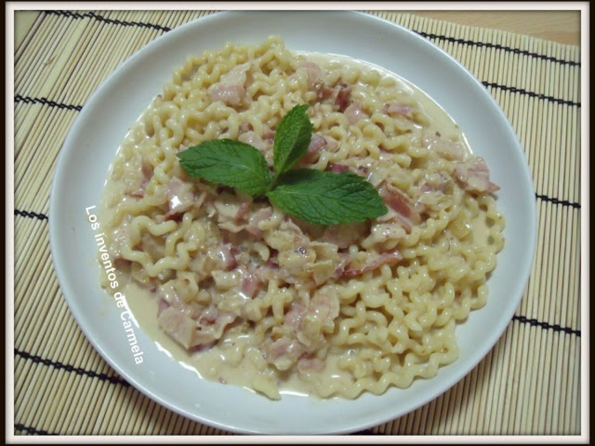 Fusilli con paté y nata vota ahora PlatoFácil15 min743 Kcal Enviar esta receta a un amigo Imprimir esta página Preguntar al autor Publicar la foto de esta receta Ingredientes 2 225 g de pasta tipo tallarines o espaghetti 2 cucharadas soperas de aceite de oliva 1 cebolla grande 500 ml de nata 150 g de bacon en trocitos 1 cucharada sopera de paté o foiegras Sal y pimienta