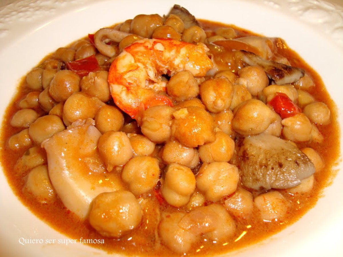 Garbanzos estofados de marisco y guindilla con salteado de setas