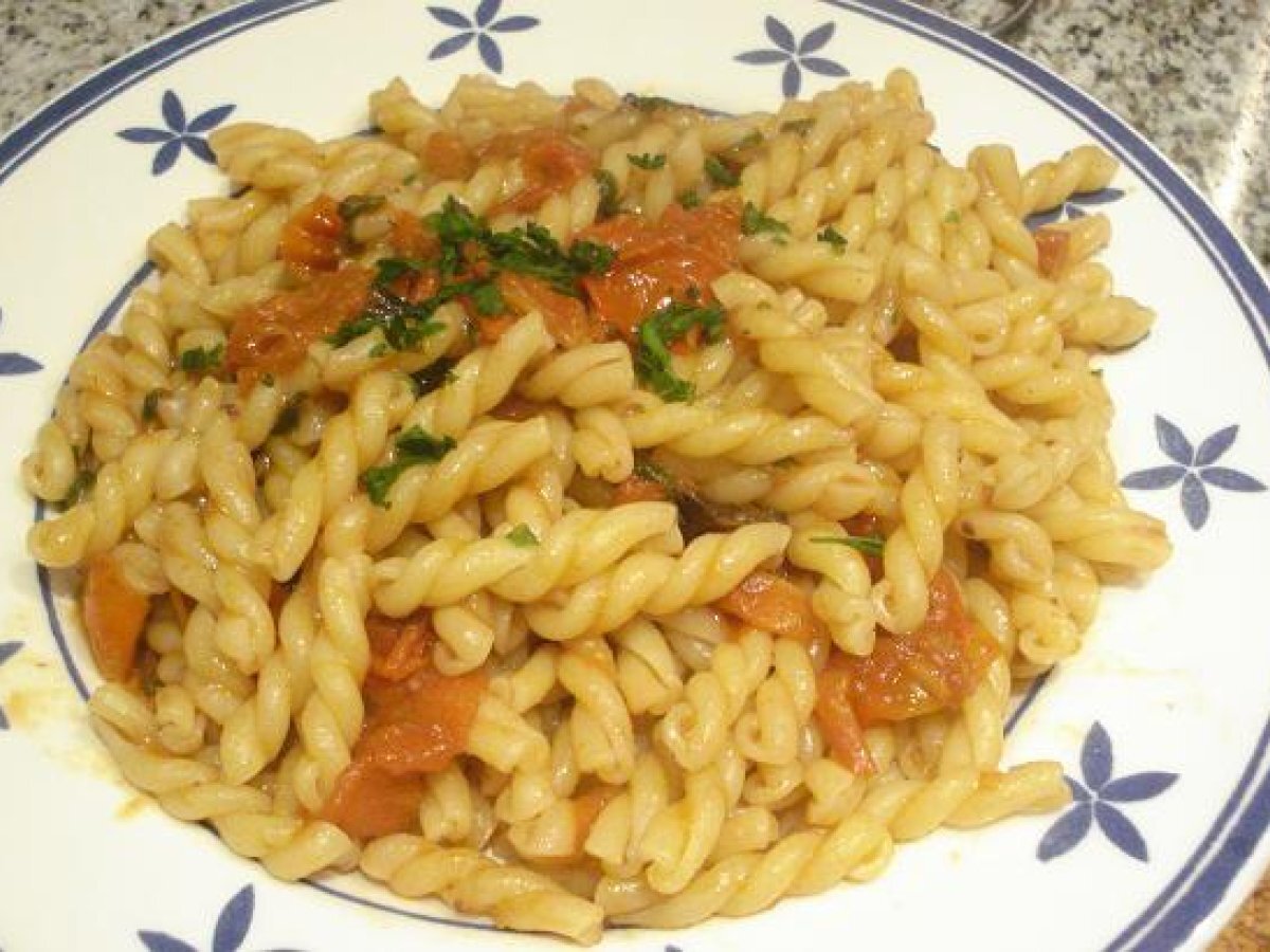 Gemelli con pomodorini e olive nere (pasta con cherry y aceitunas negras)