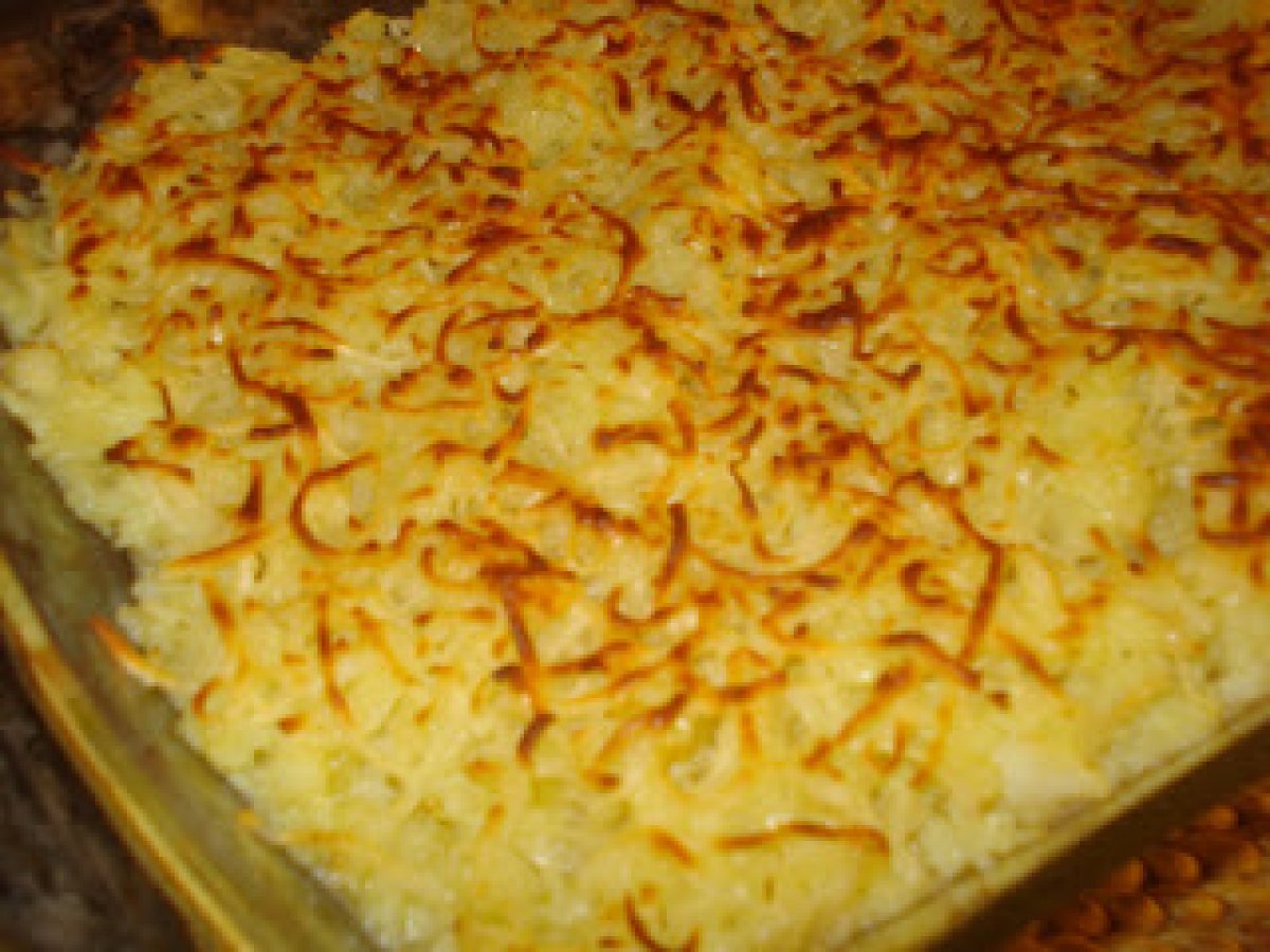 Gratinado de patatas, cebolla y bacalao PlatoFácil30 min492 Kcal Enviar esta receta a un amigo Imprimir esta página Preguntar al autor Publicar la foto de esta receta Ingredientes 2 3 trozos de bacalao desalado (unos 450 g). 2 cebollas grandes (no escatimeis en cebolla, quedará más jugoso). 1 sobre de puré de patatas. Queso rallado Pan rallado. Sal, pimienta negra . aceite de oliva virgen extra. Costo estimado: 5.54Euros€ (2.77€/porción)