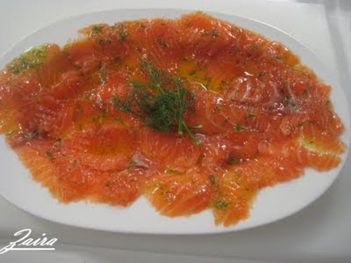 Gravlax o salmón marinado como en escandinavia PlatoFácil30 min1470 Kcal Enviar esta receta a un amigo Imprimir esta página Preguntar al autor Publicar la foto de esta receta Ingredientes 2 1 lomo de salmón limpio de espinas y con su piel 650 gr de sal gruesa 650 gr de azúcar ramitas de eneldo fresco eneldo picado fresco granos de pimientas variadas unas bayas de enebro un poco de aceite para luego conservarlo. Costo estimado: 6.22Euros€ (3.11€/porción)