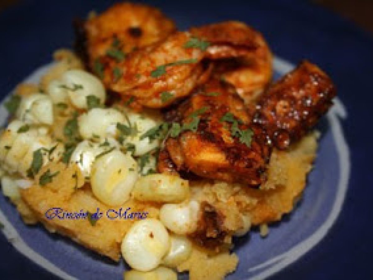 Kebab de camarones marinados pulpo PlatoFácil55 min Enviar esta receta a un amigo Imprimir esta página Preguntar al autor Publicar la foto de esta receta Ingredientes 2 dos patatas grandes 8 dientes de ajos una cucharadita de pimienta negra en grano una cucharadita de cominos sal vinagre de vino blanco pasta de ajipanca aceite de oliva vino blanco cilantro perejil guindilla molida un choclo 250 g de pulpo cocido 250 g de langostinos crudos