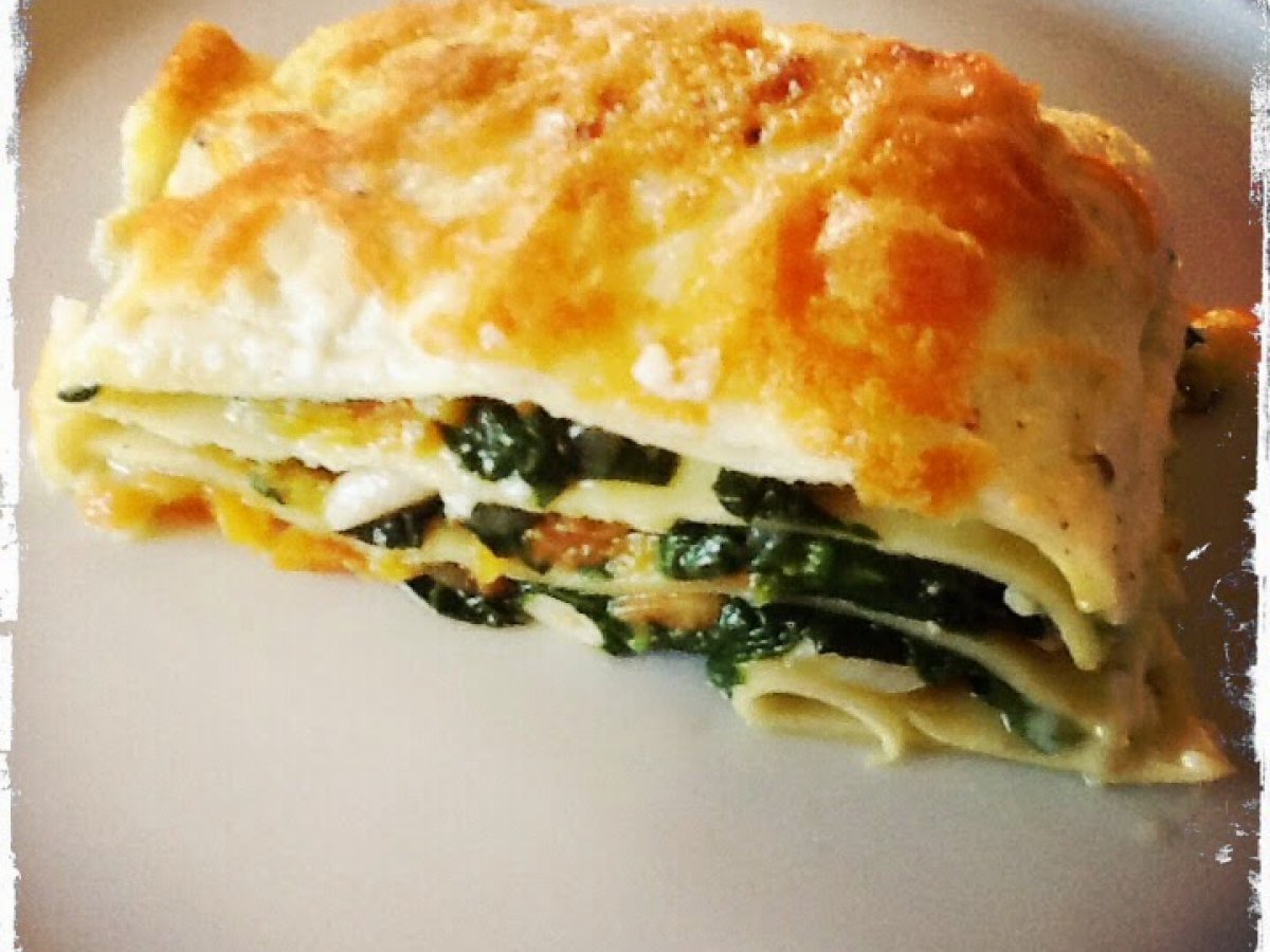 Lasaña de espinacas, zanahorias y piñones
