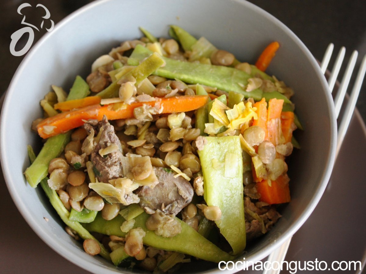 Lentejas con higaditos y verduras PlatoMedio1 hora411 Kcal Enviar esta receta a un amigo Imprimir esta página Preguntar al autor Publicar la foto de esta receta Ingredientes 2 100 gr lentejas 100 gr higaditos de ternera 100 gr de judías verdes 1/2 calabacín 1/2 puerro 1 zanahoria grande 2 dientes de ajo 4 cd aceite 1 hoja de laurel 1 ramita de perejil sal Costo estimado: 3.37Euros€ (1.68€/porción)
