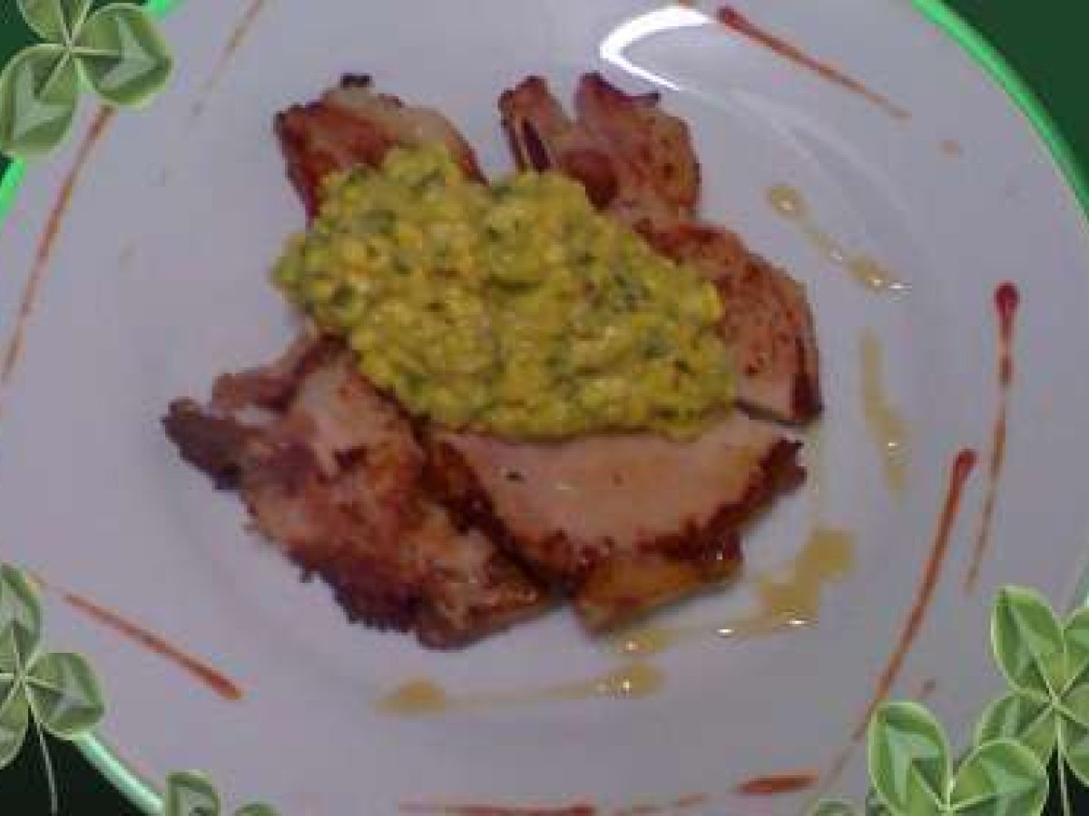 Lomo de cerdo ahumado a la parrilla con crema fria de aguacate,c PlatoFácil40 min Enviar esta receta a un amigo Imprimir esta página Preguntar al autor Publicar la foto de esta receta Ingredientes 4 Ingredientes: 2 Rebanadas(chuleta)de lomo de cerdo ahumado de 2cm de grosor por 80 g cada uno, 1 aguacate pequeño bastante maduro, un 1/4 de mitad de un pepino, 1 ramita de cebolla verde(cebollin), 1/2 cucharadita de vinagre blanco,sal,aceite de oliva,aceite de soya,pimienta y una cucharadita de miel,,,?