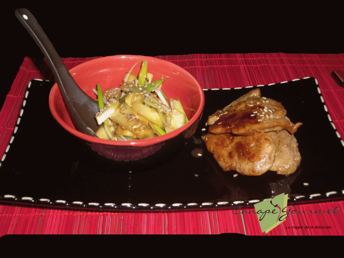 Lomo de cerdo con jengibre PlatoMedio50 min Enviar esta receta a un amigo Imprimir esta página Preguntar al autor Publicar la foto de esta receta Ingredientes 2 400 gr. de Lomo de Cerdo. Marinada: 1 Manzana o Pera Rallada. 50 gr. de Jengibre Rallado. 1 Cebolla blanca Rallada. 150 ml de Salsa Soya. 50 ml de Sake o Vino Blanco. 40 ml de Mirin. Ensalada: 2 Tallos de Cebollín Picado Fino. 1 Pepino Cortado en Trozos. Aderezo Para Ensalada: 50 ml de Salsa Soya. 25 ml de Vinagre de Manzana. 1 Cucharadita de Aceite de sésamo. 1 Cucharada de Semillas de Ajonjolí.