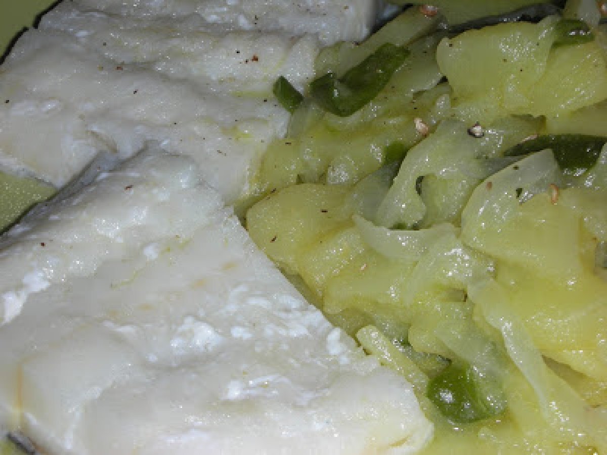 Lomos de bacalao con patatas panadera PlatoFácil40 min281 Kcal Enviar esta receta a un amigo Imprimir esta página Preguntar al autor Publicar la foto de esta receta Ingredientes 8 8 trozos de bacalao desalado. 100 g de aceite de oliva 100 g de agua 600 g de patatas cortadas en rodajas de 0'5 cm 100 g de pimiento verde cortado en tiras finas 1 cebolla cortada en tiras finas Sal Costo estimado: 13.99Euros€ (1.75€/porción)