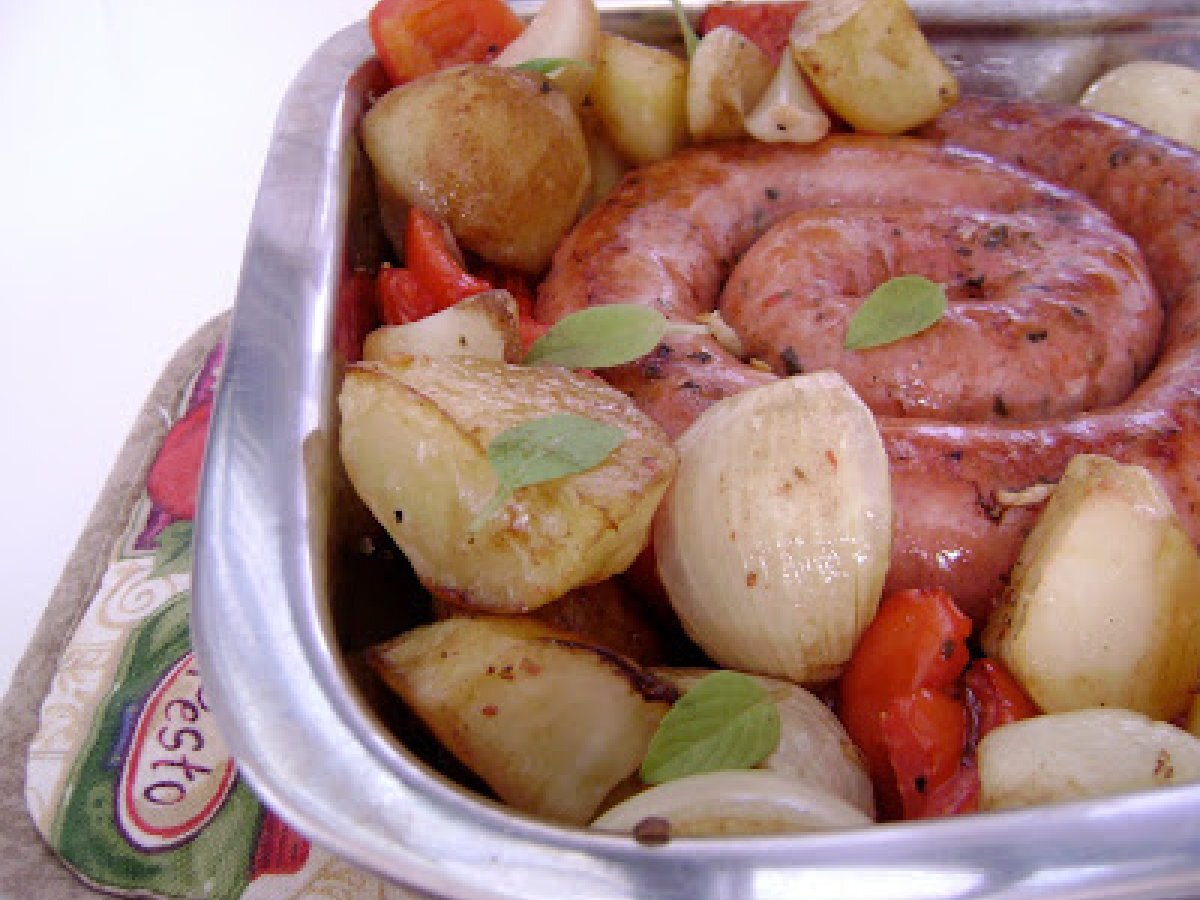 Longaniza al horno con tomate, cebolla y patata PlatoFácil30 min Enviar esta receta a un amigo Imprimir esta página Preguntar al autor Publicar la foto de esta receta Ingredientes 4 800g de longaniza de puerco 500g de patata 2 cebollas medias 5 tomates maduros y firmes 2 cucharadas de aceto balsámico Aceite de oliva Sal y pimienta recién molidos Albahaca fresca
