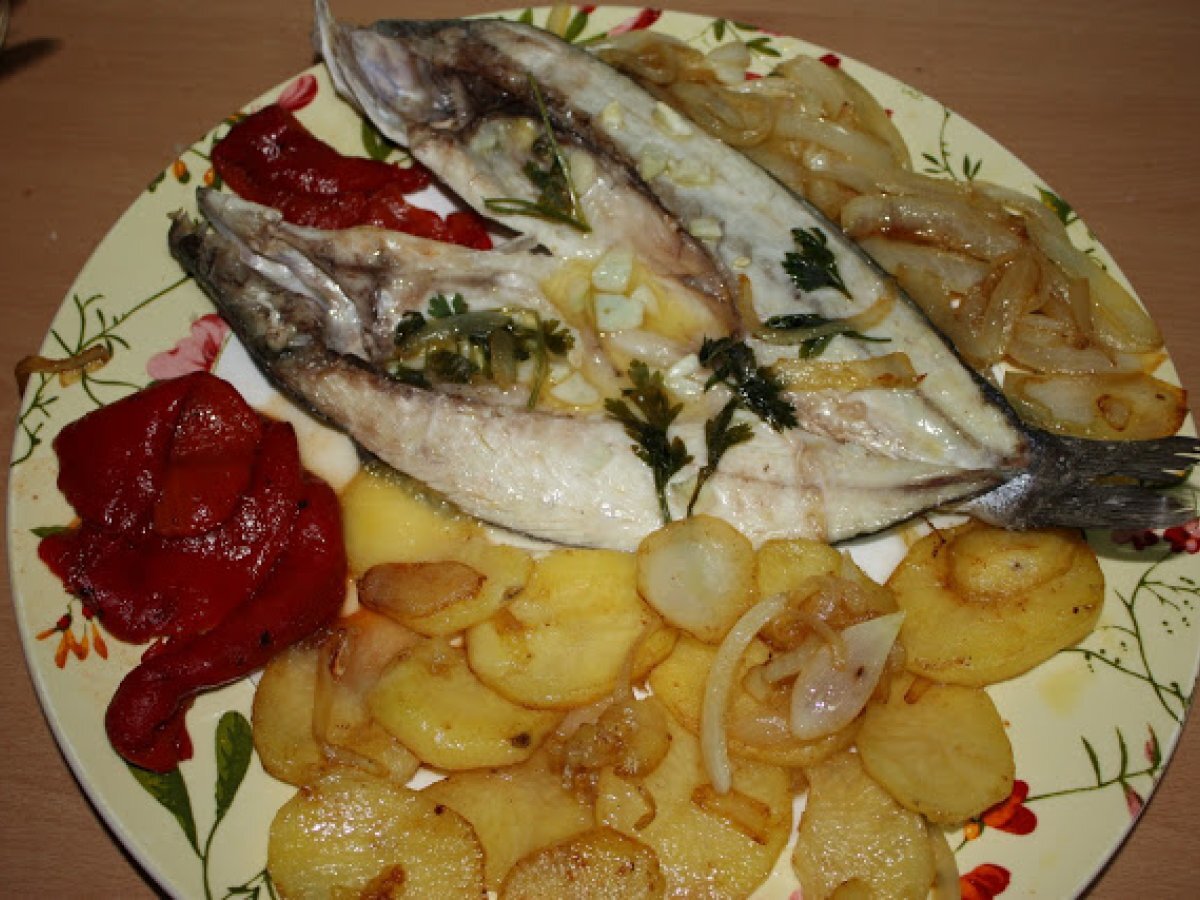 Lubina con patatas, cebolla confitada y pimientos rojos asados PlatoFácil35 min Enviar esta receta a un amigo Imprimir esta página Preguntar al autor Publicar la foto de esta receta Ingredientes 2 1 lubina de ración 2 ajos 1 poco de perejil 1 patata mediana media cebolla medio pimiento asado sal, aceite, vino blanco y zumo de medio limón
