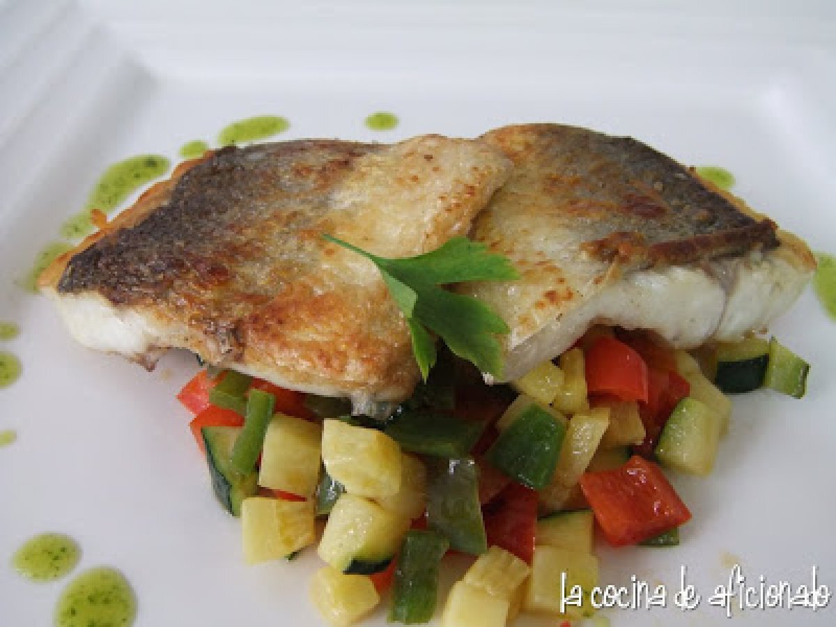 Otra forma de cocinar la lubina y que también queda muy buena es a la plancha. En este caso sobre un pisto de verduras variadas.