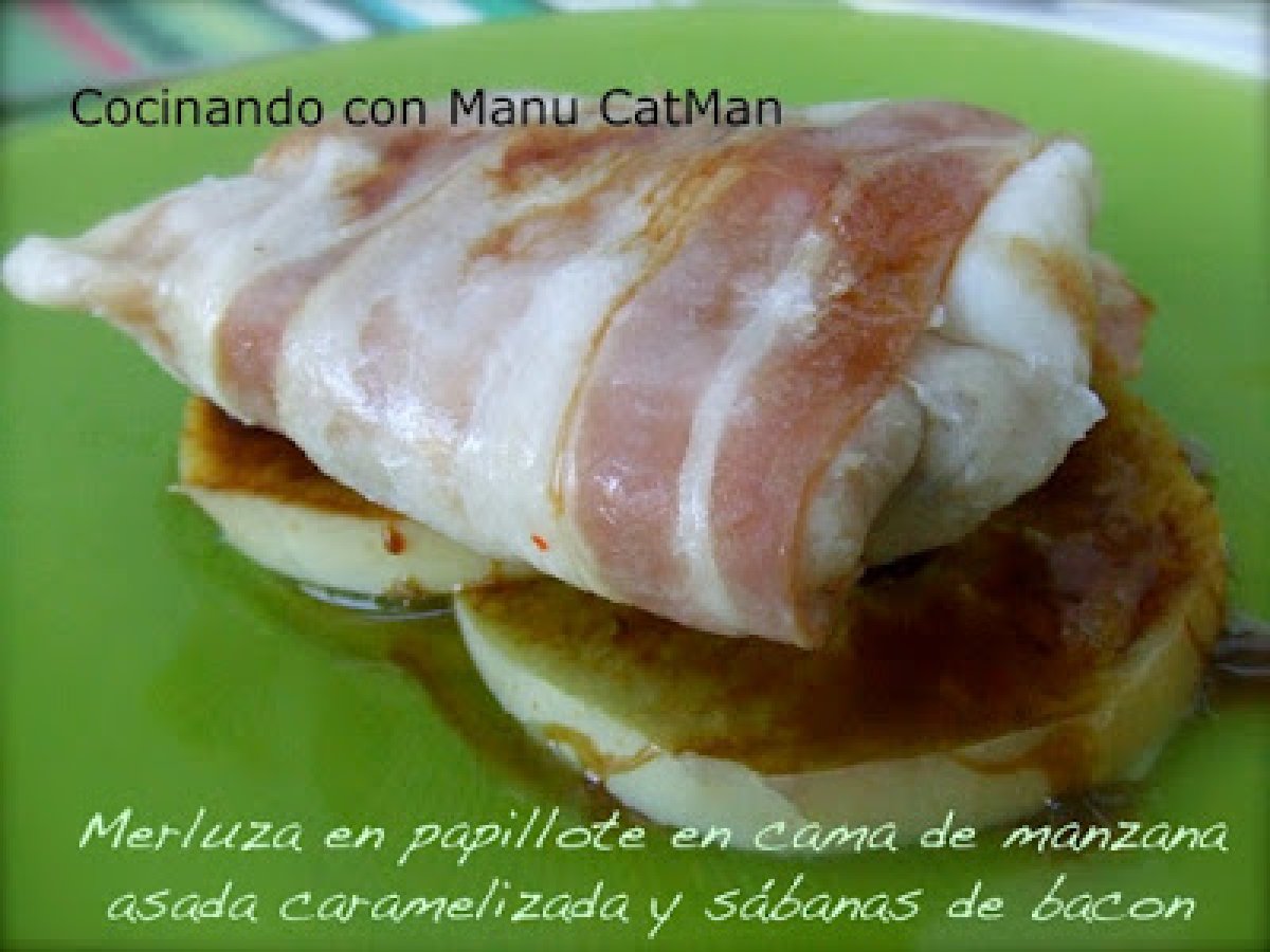 Merluza en papillote en cama de manzana asada caramelizada y sábanas de bacon PlatoFácil45 min202 Kcal Enviar esta receta a un amigo Imprimir esta página Preguntar al autor Publicar la foto de esta receta Ingredientes 2 Lomos de merluza Bacon en tiras 2 rodajas de manzana golden por cada lomo caramelo líquido 800 g de agua