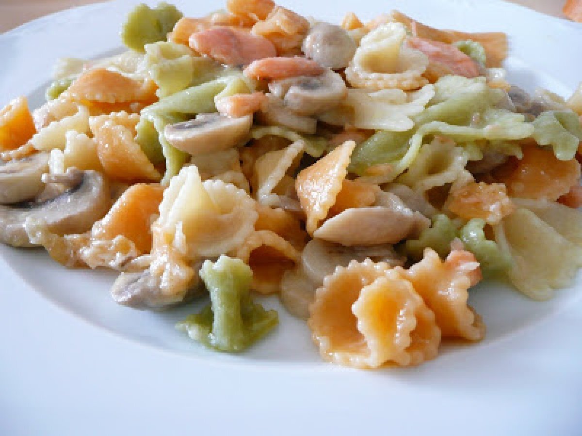 Pasta con champiñones y salmón ahumado PlatoFácil25 min571 Kcal Enviar esta receta a un amigo Imprimir esta página Preguntar al autor Publicar la foto de esta receta Ingredientes 1 Champiñones Salmón ahumado Aceite de oliva virgen extra 1 cebolla Leche Harina Sal Costo estimado: 2.19Euros€ (2.19€/porción)