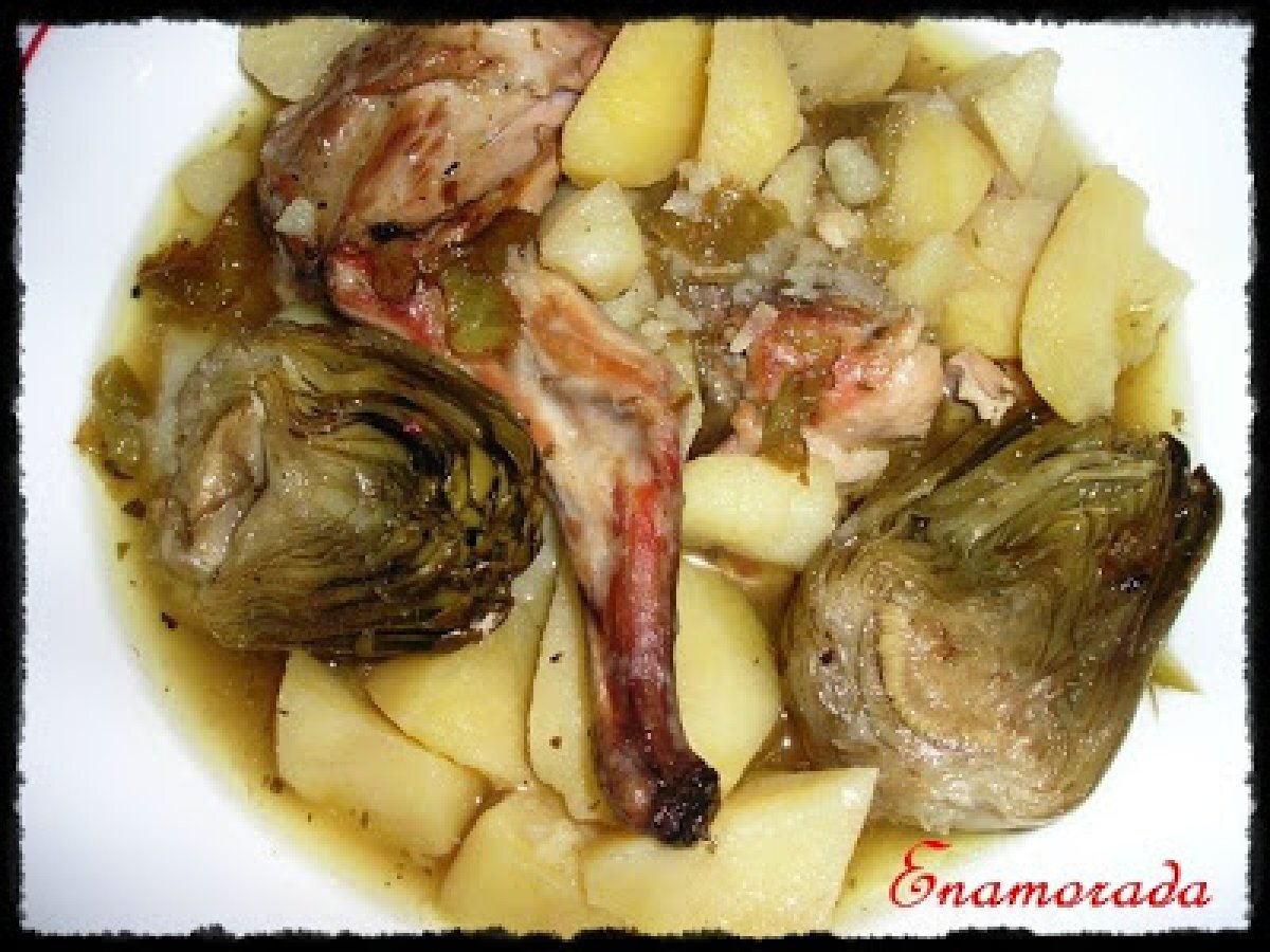 Patatas con conejo y alcachofas