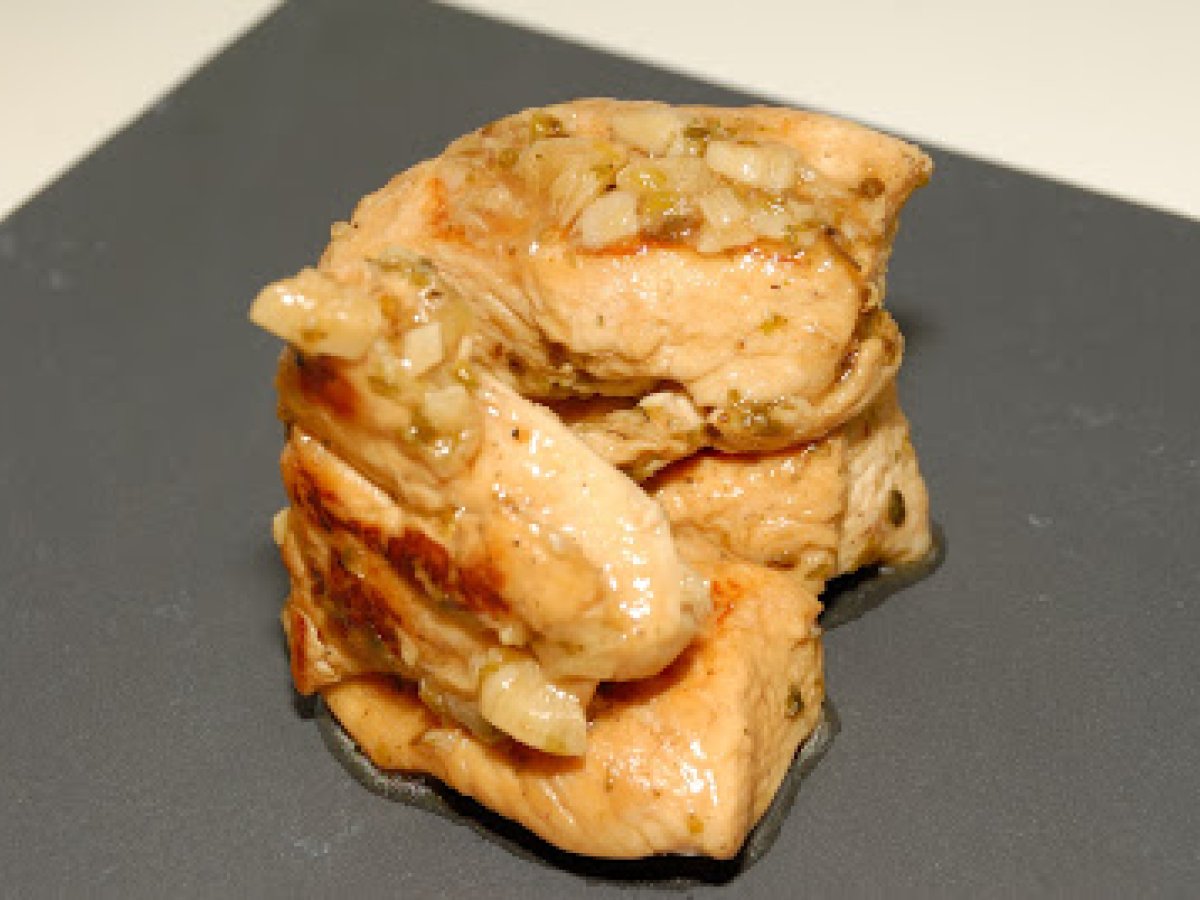 Pechuga de pollo al ajillo (fussioncook) PlatoMedio25 min Enviar esta receta a un amigo Imprimir esta página Preguntar al autor Publicar la foto de esta receta Ingredientes 4 500 g de pechuga de pollo 8 dientes de ajos granditos 1 cucharada de orégano Un chorrito de vino dulce Aceite de Oliva Virgen Extra Sal gorda Pimienta Costo estimado: 7.31Euros€ (1.83€/porción)