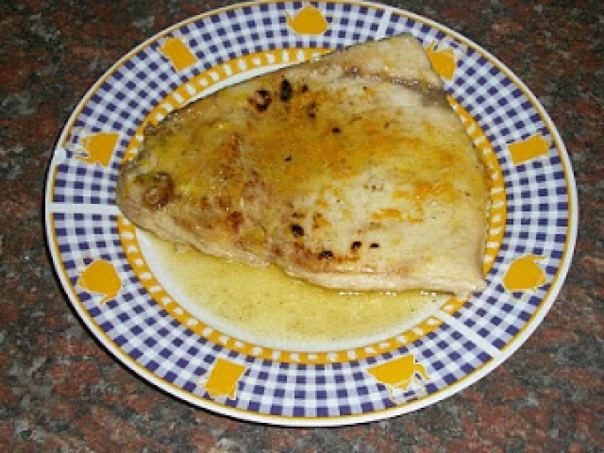 Pez espada o emperador con salsa de naranja PlatoFácil50 min1781 Kcal Enviar esta receta a un amigo Imprimir esta página Preguntar al autor Publicar la foto de esta receta Ingredientes 2 1 filete de pez espada por persona. 1 clavo de olor por filete. 1 hoja de laurel. 1/2 naranja por filete. 100 cc de caldo de pescado Aceite para freir. Harina para pasar el pescado. Pimienta al gusto. Ralladura de la piel de una naranja. Una cucharada de postre de maicena disuelta en agua fria.