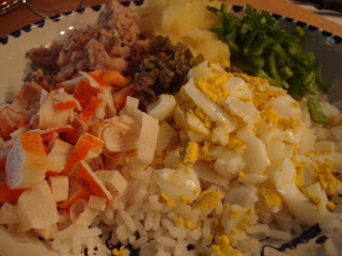 Pimientos rellenos de ensalada de arroz PlatoMedio50 min151 Kcal Enviar esta receta a un amigo Imprimir esta página Preguntar al autor Publicar la foto de esta receta Ingredientes 4 Arroz cocido Huevo cocido Pimiento verde Atún en lata Piña en su jugo Palitos de surimi Un poquito de mayonesa Alcaparras Pimientos del piquillo.
