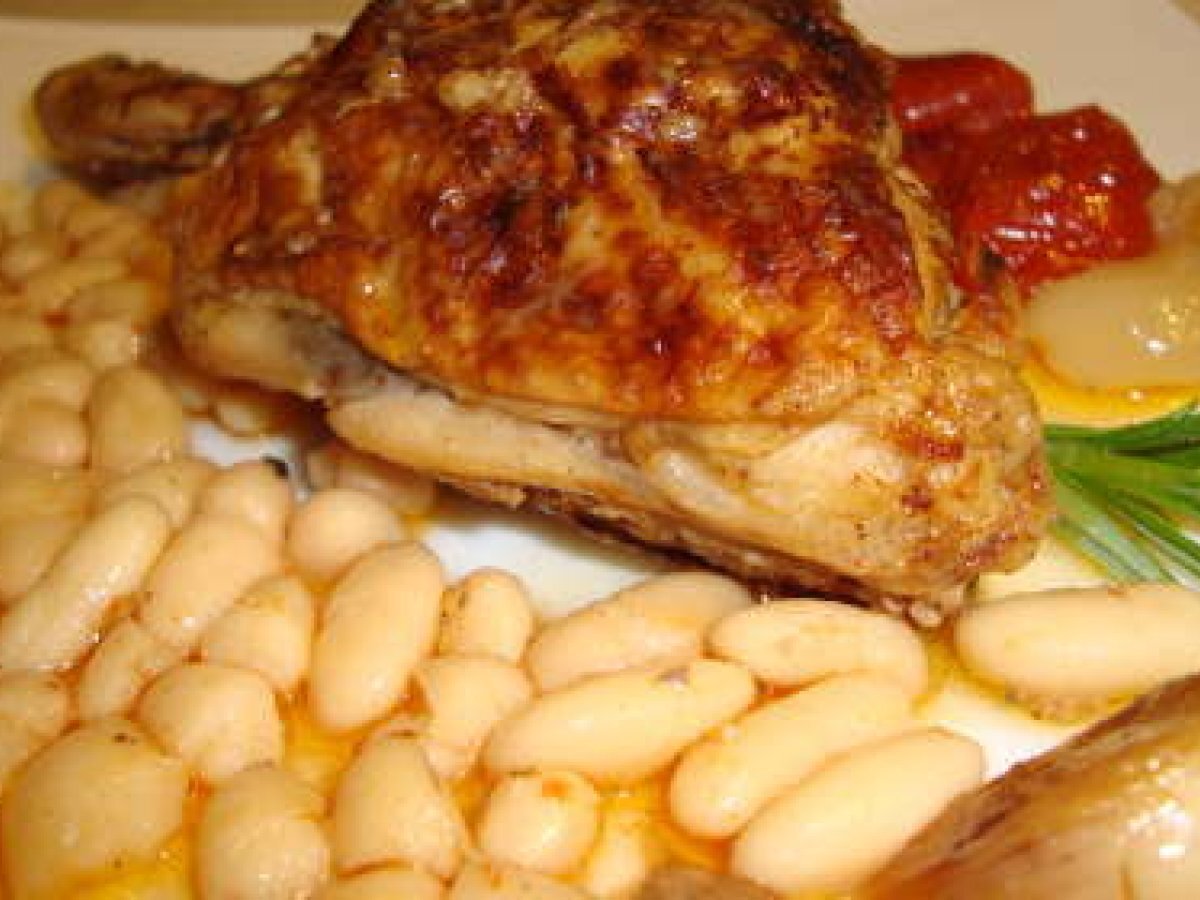 Pollo al horno con judias blancas PlatoMedio1 h 30 m Enviar esta receta a un amigo Imprimir esta página Preguntar al autor Publicar la foto de esta receta Ingredientes 2 piernas de pollo cebolla tomate ajos enteros bote de judías blancas laurel canela pimentón dulce pimienta sal pastilla de sopicaldo aceite de oliva