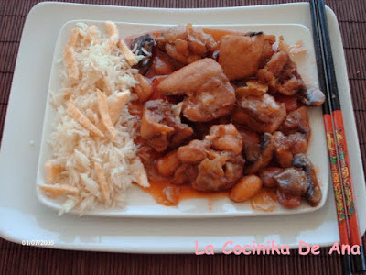 Pollo con almendras en salsa de soja PlatoFácil1 h 15 m Enviar esta receta a un amigo Imprimir esta página Preguntar al autor Publicar la foto de esta receta Es de la magia. Ingredientes 2 1 pollo deshuesado y pelado 3cucharadas de salsa de soja 4cucharadas de aceite de oliva 30 almendras, peladas 1/2 cucharada de curry 1 cebolla 3 ó 4 champiñones 1zanahoria 1tomate 1cuchara de harina de maíz 1vaso de caldo