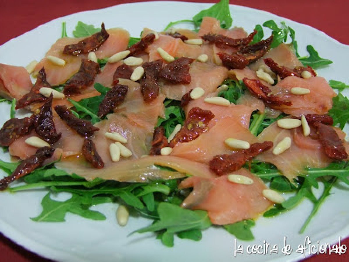 Este salmón ahumado con rúcula y tomates secos es un aperitivo sencillo de hacer, también nos puede servir como entrante.