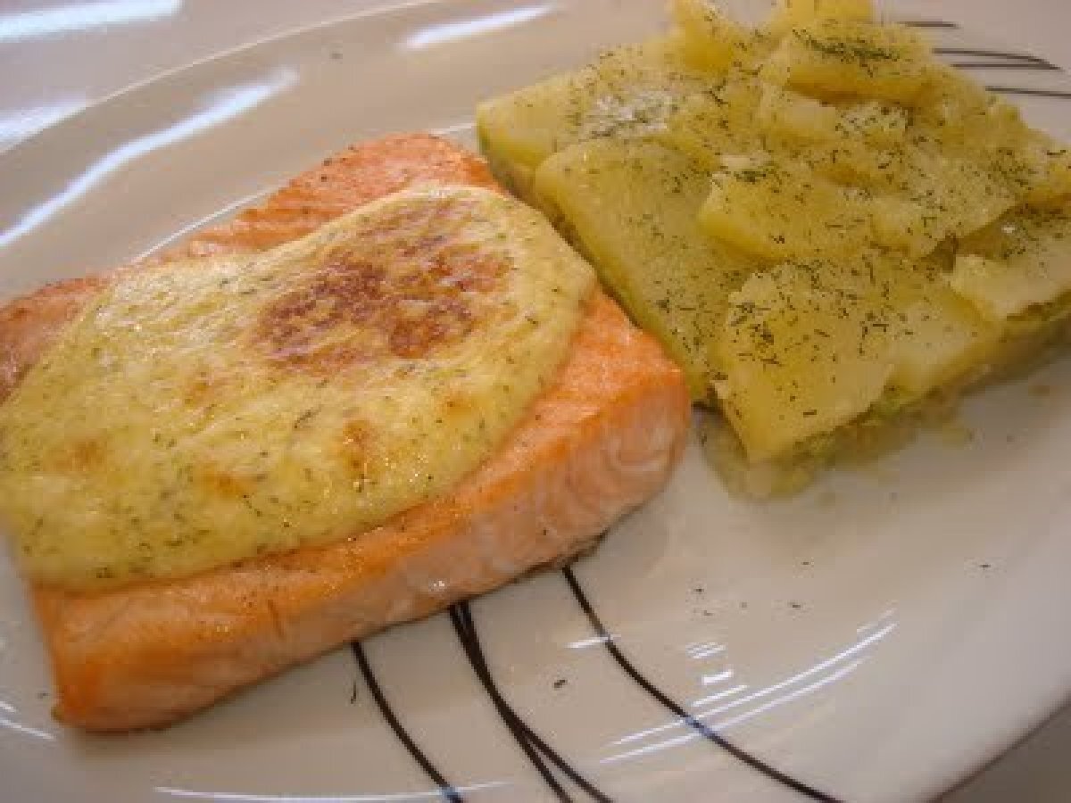 Salmón con gratinado de mayonesa al eneldo PlatoFácil43 min1007 Kcal Enviar esta receta a un amigo Imprimir esta página Preguntar al autor Publicar la foto de esta receta Ingredientes 2 1 lomo de salmón 150 ml de mayonesa 1 yemas de huevo Eneldo 2 patatas 2 aguacates Aceite Sal Pimienta negra molida Costo estimado: 4.53Euros€ (2.27€/porción)