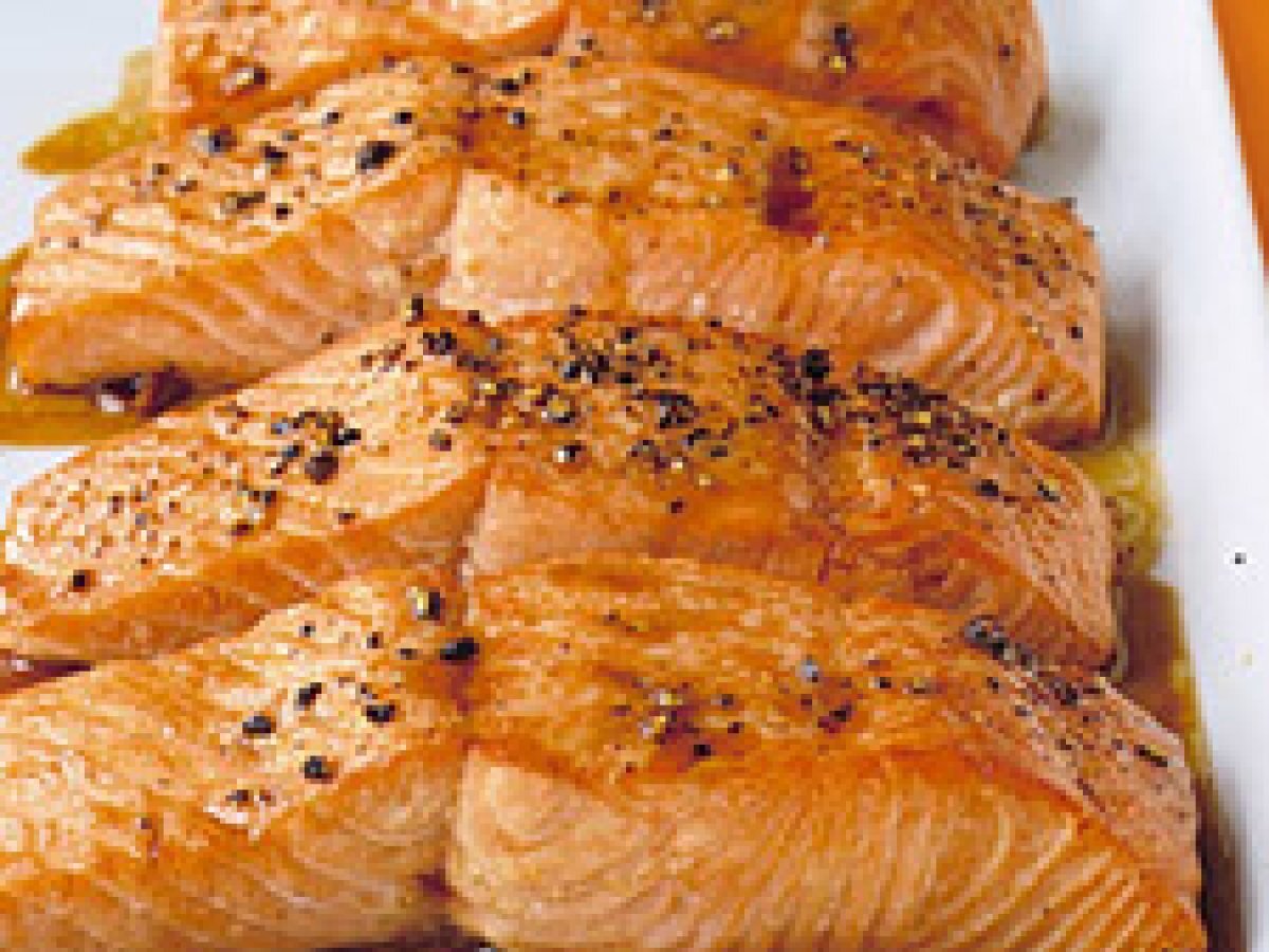 Salmón glaseado a la soja (salmón ford) PlatoFácil35 min Enviar esta receta a un amigo Imprimir esta página Preguntar al autor Publicar la foto de esta receta Ingredientes 2 1/4 taza de azúcar morena (o rubia) 1/4 taza de aceite de oliva 3 cucharadas de salsa de soja 2 cucharadas de jugo de limón fresco 2 cucharadas de vino blanco seco o agua 1 kg de filete de salmón Rodajas de limón, para servir