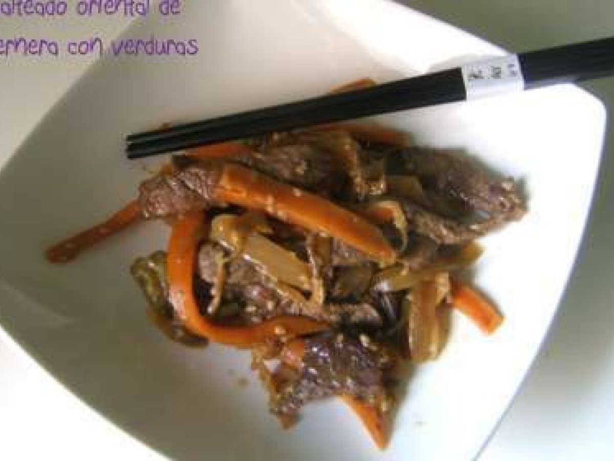 Salteado oriental de ternera con verduras PlatoMedio25 min Enviar esta receta a un amigo Imprimir esta página Preguntar al autor Publicar la foto de esta receta Ingredientes 2 INGREDIENTES * 2 filetes de ternera * 1 pimiento verde * 1 zanahoria * 1 cebolla * 2 puñaditos de brotes de soja * 1 cucharada de sésamo * 2 cucharadas de salsa de soja * 1 cucharada de vinagre de arroz * 1 cucharada de miel * aceite de oliva * pimienta