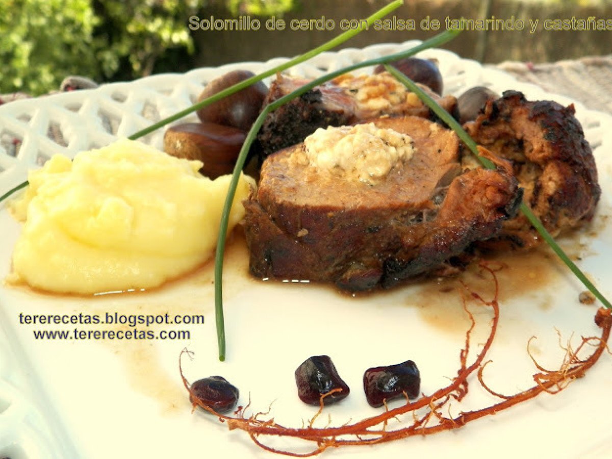 Solomillo de cerdo con salsa de tamarindo y castañas.