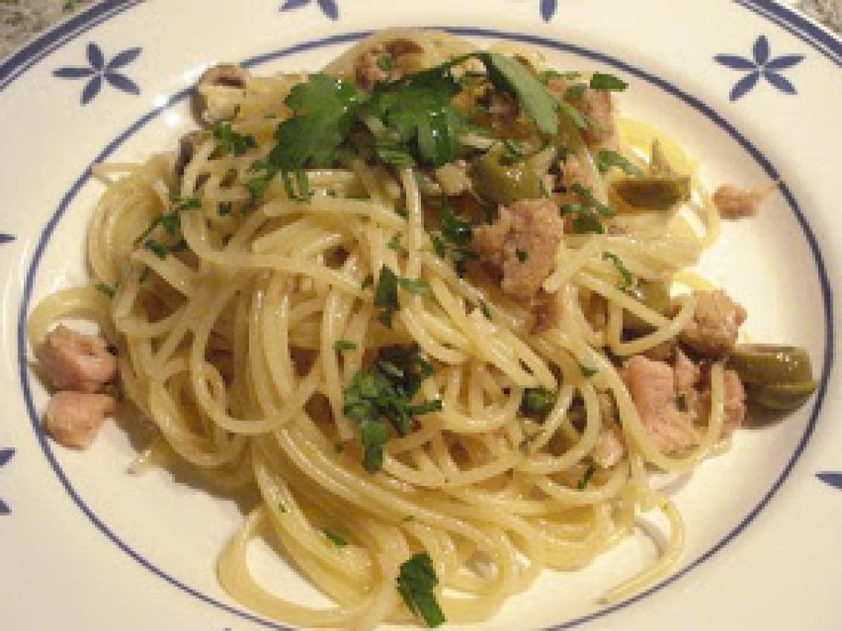 Spaghetti tonno e olive (espaguetis atún y aceitunas) PlatoFácil20 min583 Kcal Enviar esta receta a un amigo Imprimir esta página Preguntar al autor Publicar la foto de esta receta Ingredientes 2 220 g de espaguetis 1 lata de atún aceitunas verdes alcaparras 1 diente de ajo guindilla perejil vino blanco aceite Costo estimado: 3.37Euros€ (1.69€/porción)