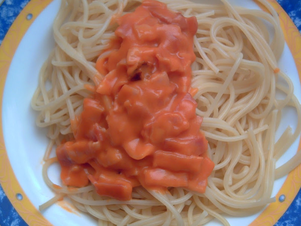 Spaguetti con carbonara picante vota ahora PlatoFácil20 min Enviar esta receta a un amigo Imprimir esta página Preguntar al autor Publicar la foto de esta receta Ingredientes 4 500 g de spaguetti 330 ml de salsa de tomate 100 ml de nata para cocinar 100 g de tiras de bacon 1/2 cebolla pequeña 1 guindilla de cayena